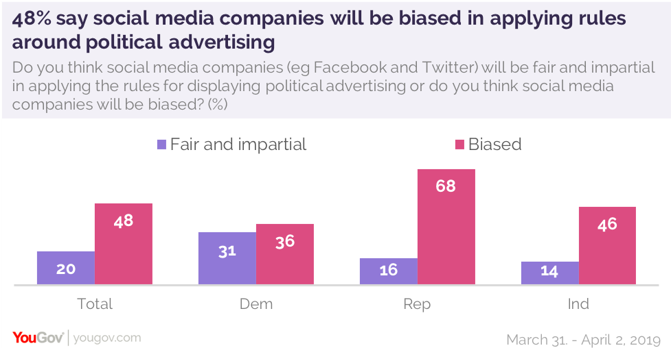 对政府监管社交媒体如何经营政治广告的支持甚至更少,只有33%的美国人认为政府应该规范社交媒体如何经营政治广告。