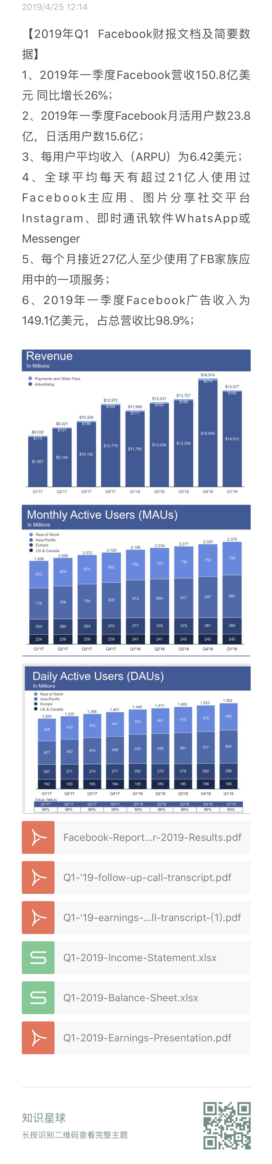 1、2019年一季度Facebook营收150.8亿美元 同比增长26%;