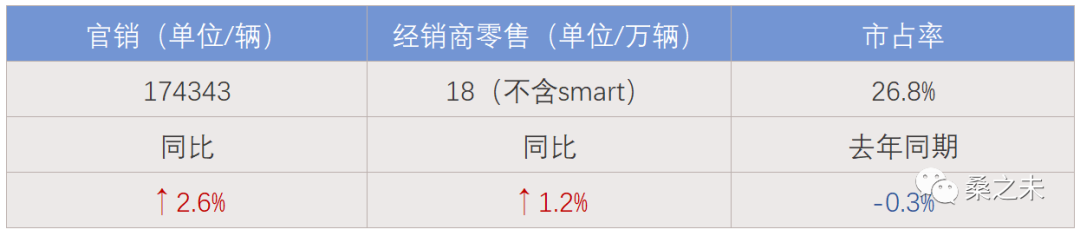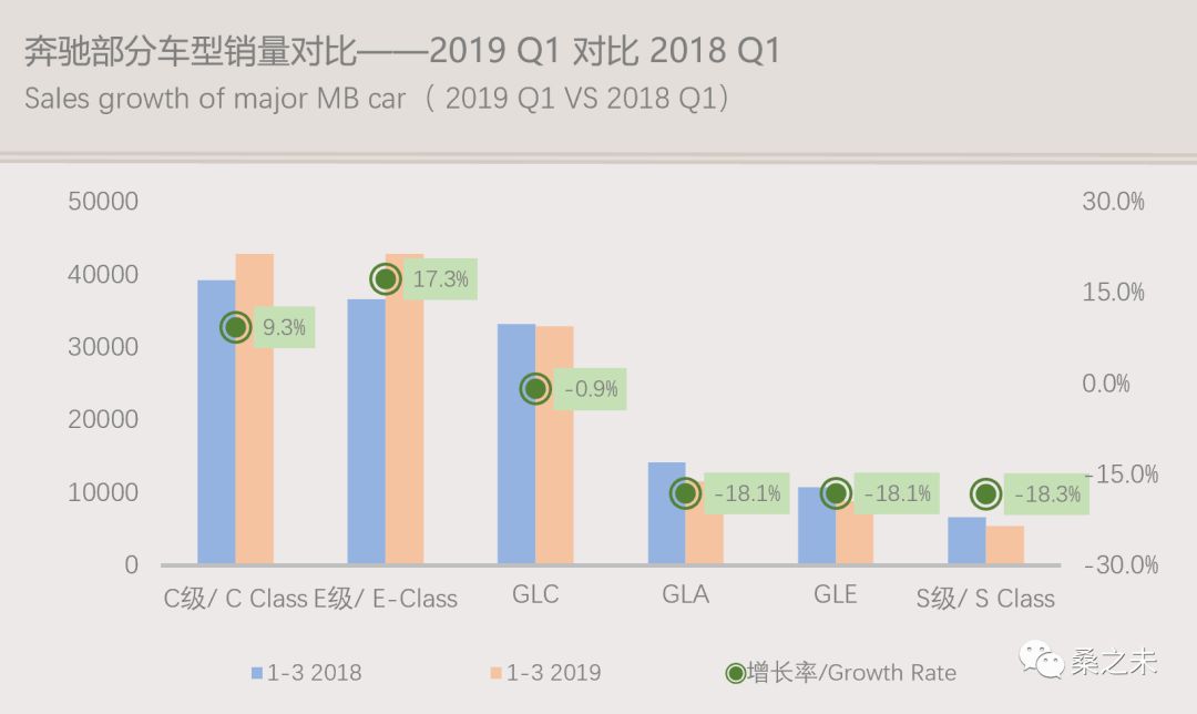 一季度,奔驰经销商零售量为18.3万辆,同比增长1.1%(注:1季度交强险数据,存在保险公司冲击开门红现象,导致数据与经销商实际零售数据有偏差),一季度奔驰市占率为27%(以20个豪华品牌经销商零售量为分母计算),主要是C级、E级、A级销量带动。