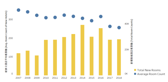在过去的十二年里(2007-2018),有近1,100家高端连锁酒店(近33万间客房)在中国内地开业,相当于2007年前所有高端酒店客房供应量的317.6%。这一期间,高端酒店的年平均新增客房数量近28,000间。随着旅游供需的变化和国家供给侧结构性改革的推动,新增酒店平均客房数在最近两年出现了下降趋势,由原来的约平均300 间减少为约 260 间(图1)。