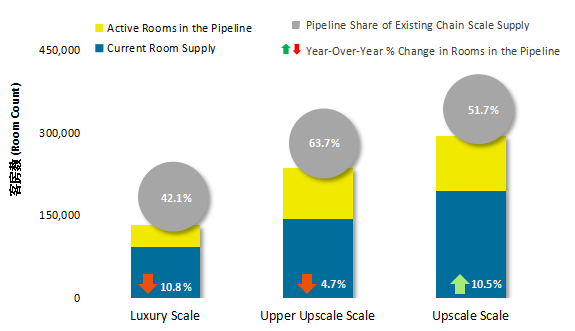 数据显示,在目前筹建的232,266间客房中,大约有100,000间来自upscale酒店项目,这相当于现有upscale酒店房间供应量的51.7% (图5)。与luxury酒店相比,尽管此份额相对较小,但2018年upscale酒店筹建客房数量同比增长高达10.5%,未来发展不容小觑。