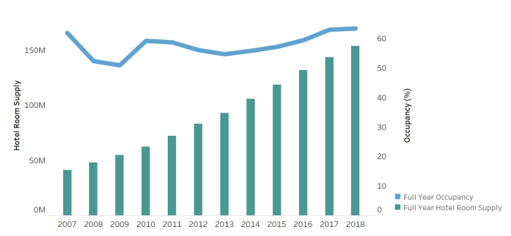 图2:中国内地2007-2018年间高端酒店客房年供给量及入住率表现