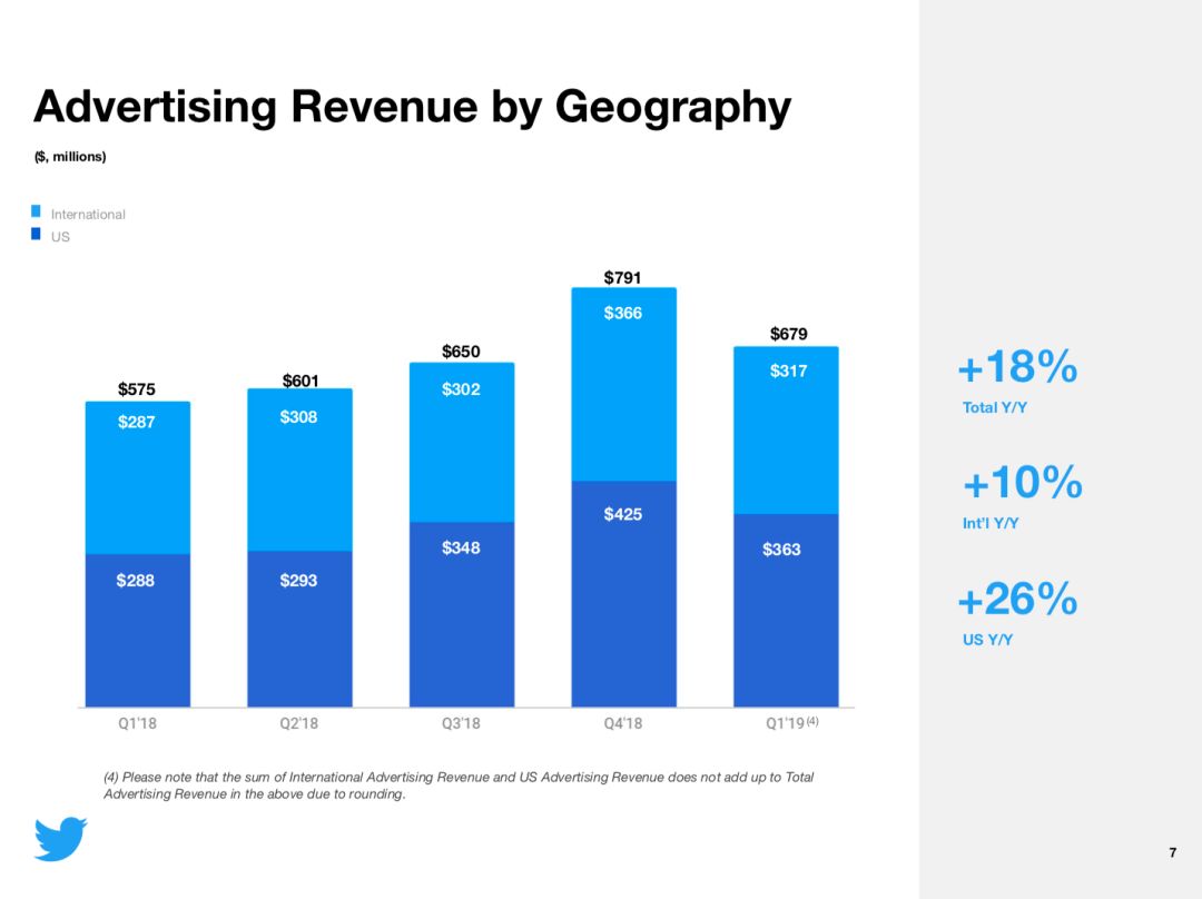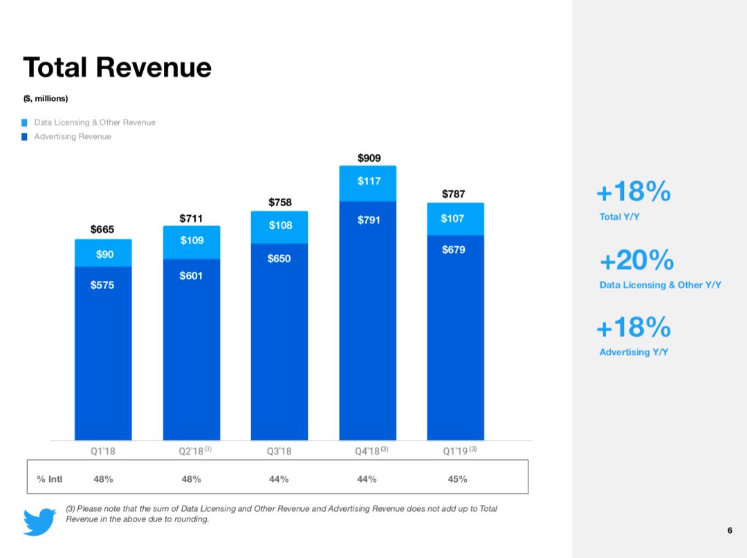 根据Twitter发布的2019年1季度财报,公司Q1营收7.87亿美元,同比增长18%,超过市场预期的7.76亿美元。主要受益于广告营收的增长,分产品看,视频广告增长强劲,尤其是Video Website Card和n-stream pre-roll ads。