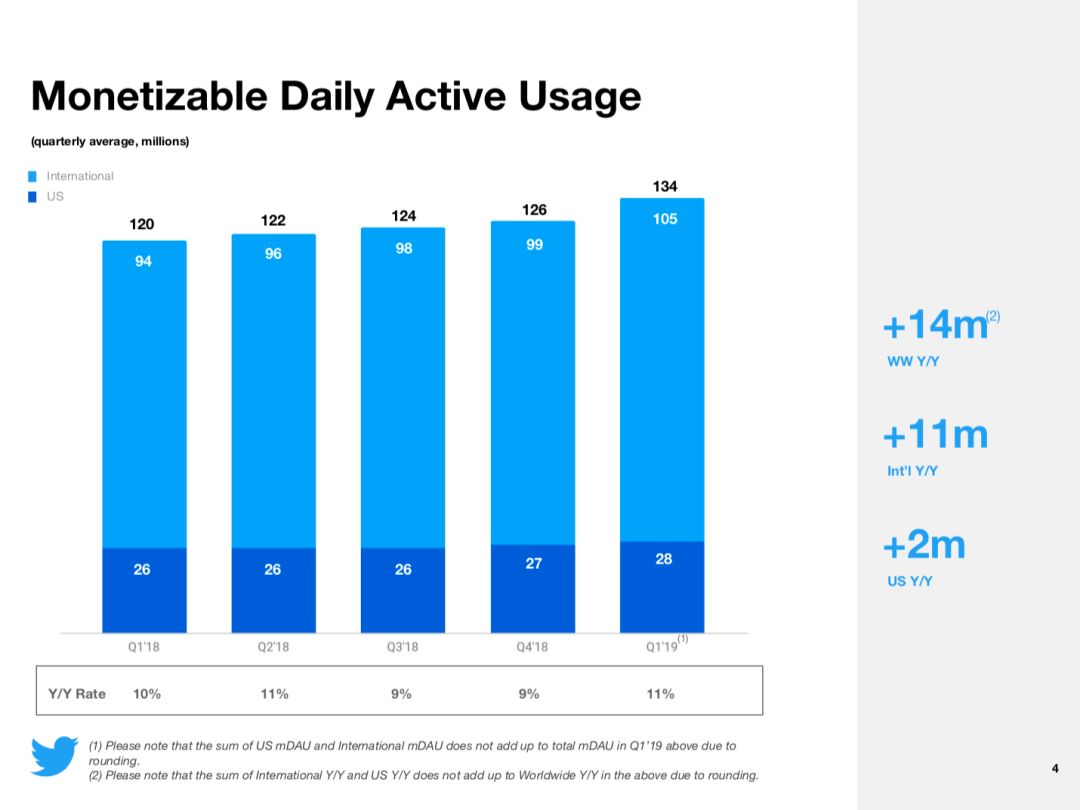 1季度,美国市场营收为4.32亿美元,同比增长25%;国际市场营收为3.55亿美元,同比增长11%,不考虑货币汇率波动影响,同比增长15%。日本仍然是Twitter第二大市场,营收同比增长16%到1.36亿美元,占整体营收17%。