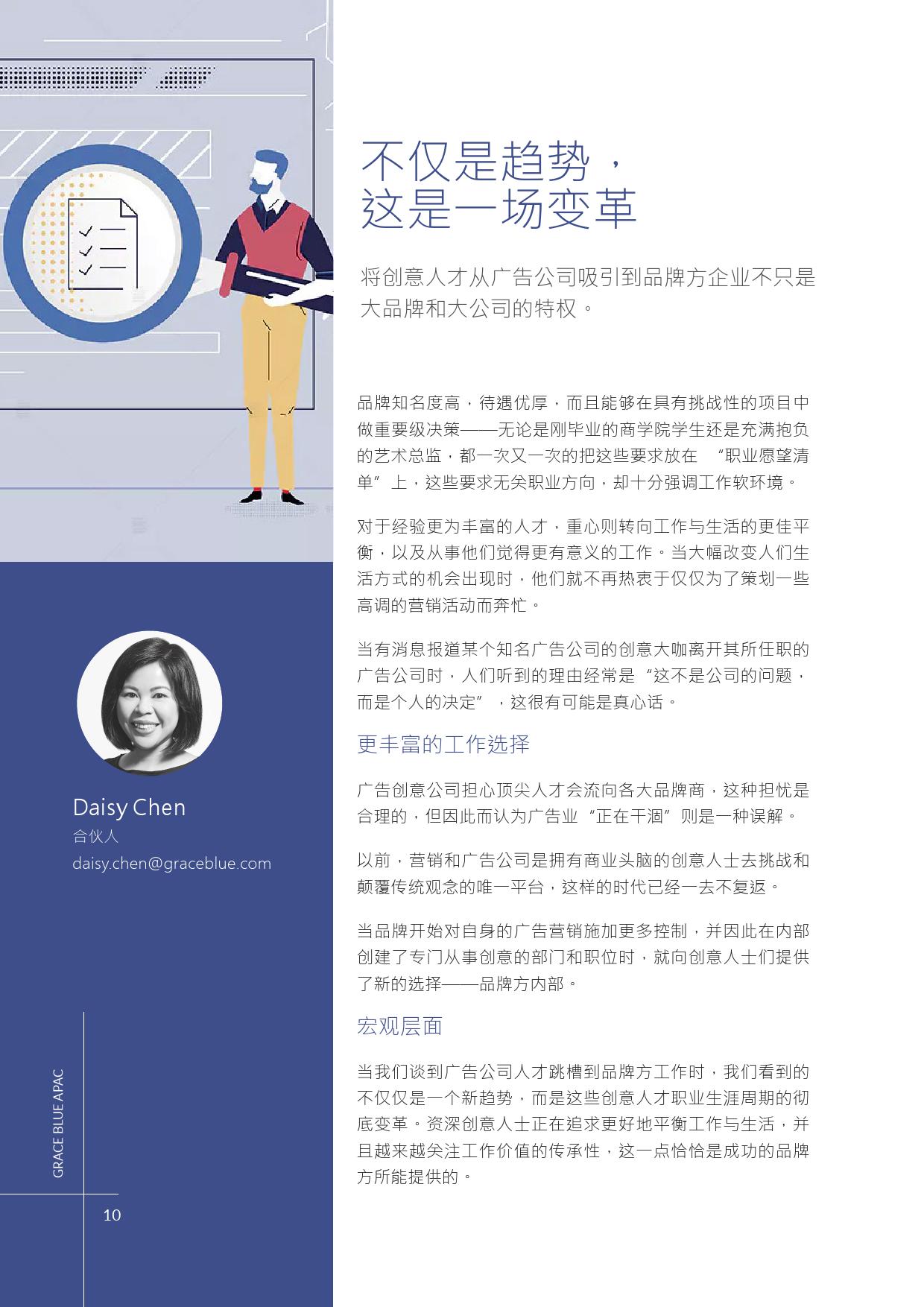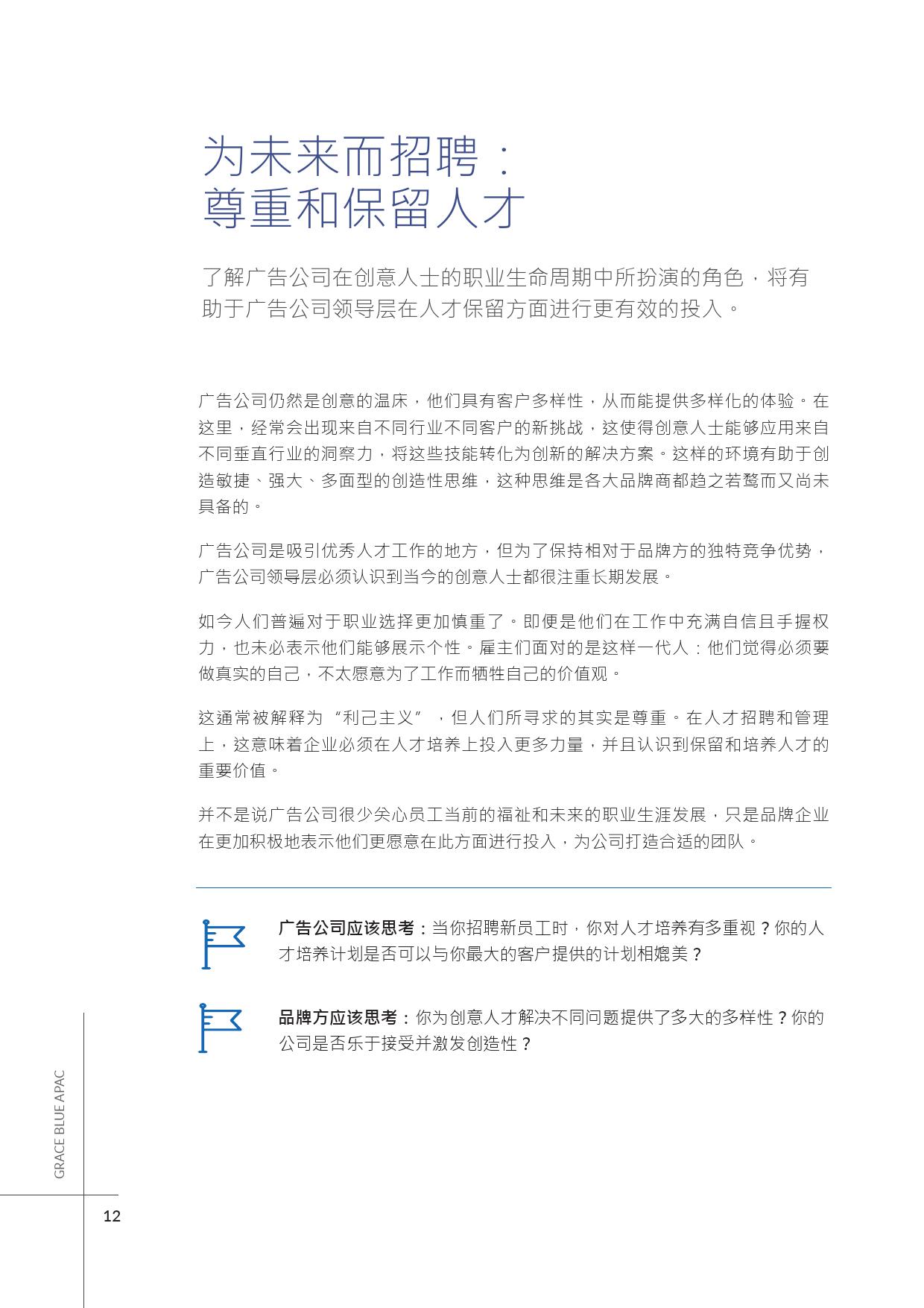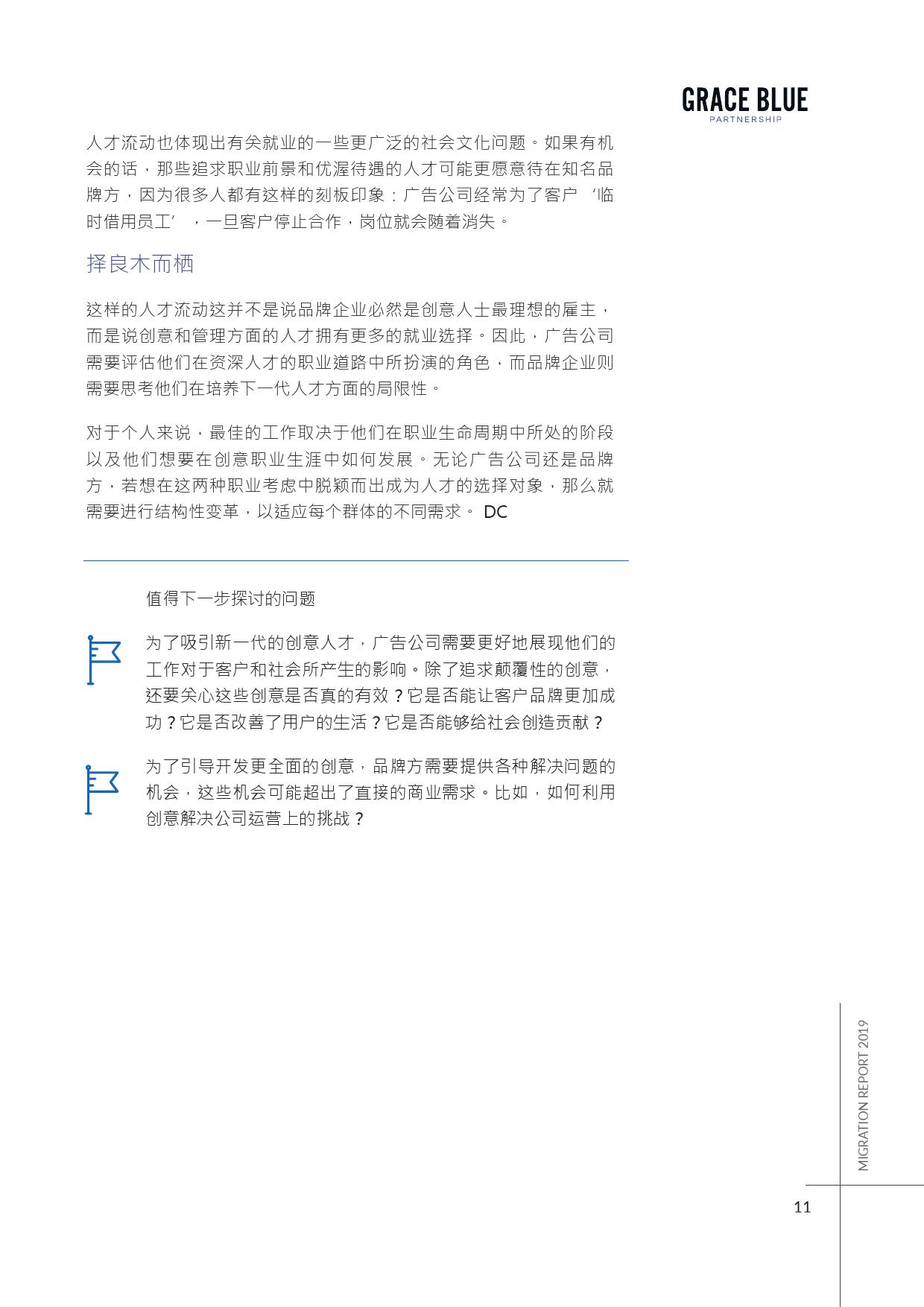 Grace Blue在本月发布的《2019亚太区人才流动报告》揭示了广告人才从广告公司向品牌方流动的一些共性原因。报告显示,资历更深的广告人才普遍更重视工作生活的平衡以及有没有机会做更有意义的工作。