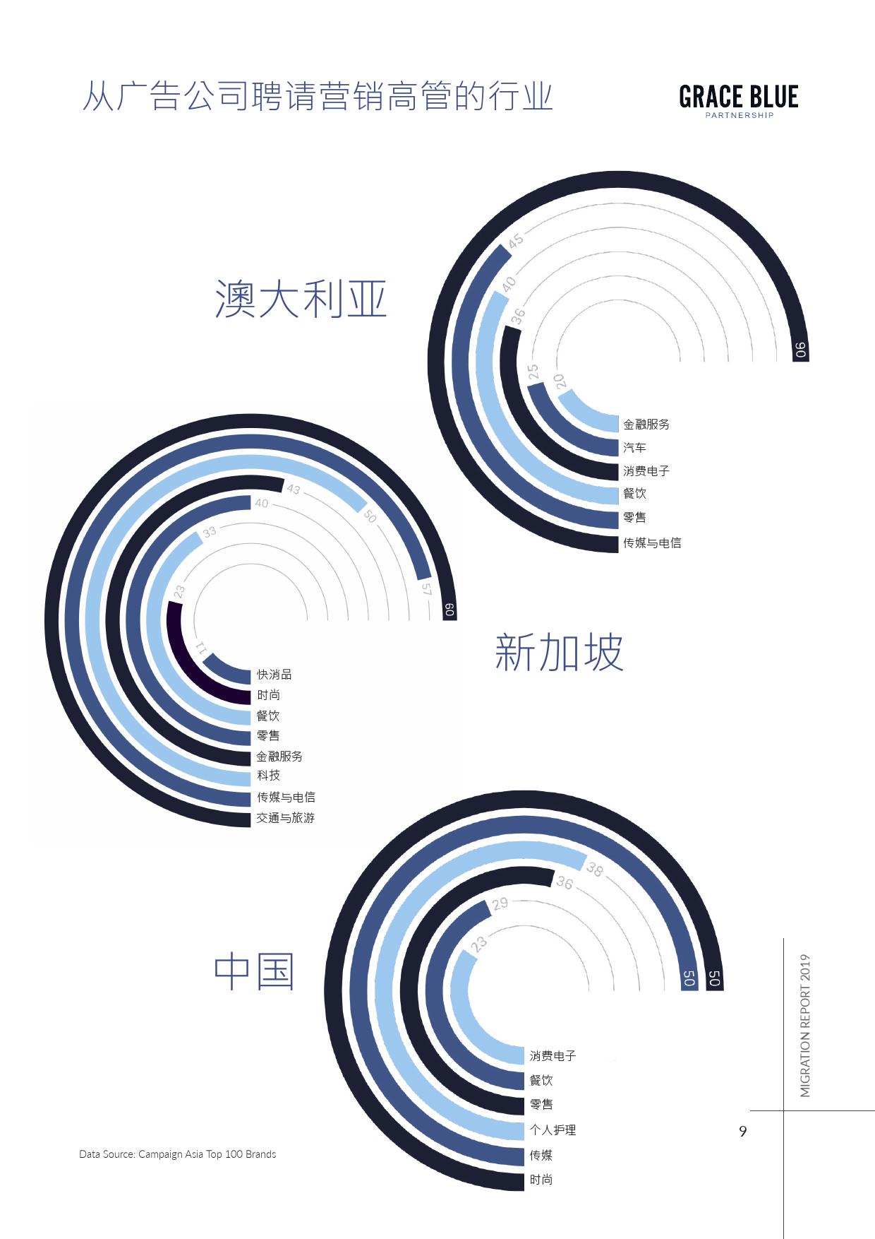 报告还追踪了几大广告人才转移去的垂直市场,媒体行业是最集中的领域,尤其在澳大利亚,90%的媒体及移动通讯公司的营销高管都有广告公司经验,零售业以45%位列第二。在中国,50%的受调时尚品牌都曾聘请来自广告公司的高管;而新加坡的交通及旅游公司更青睐有广告公司背景的人才,占比60%。