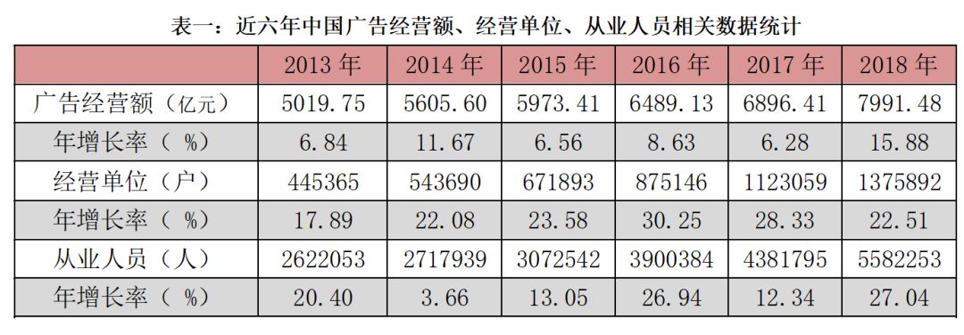 国家市场监督管理总局(以下简称“市场监管总局”)最新数据显示,2018年中国广告经营额为7991.48亿元,较上年增长15.88%(见表一),占国民生产总值(GDP)的0.88%。相比前几年个位数的增幅差距明显,是最近六年来增幅最大的一年。面对全球低迷的广告市场和持续走低的世界经济形势,是什么支撑中国广告业走出一条上扬曲线?通过以下数据分析,或许可以略知一二。