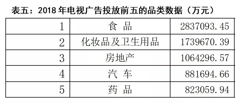 2018年对电视广告贡献排在前五的品类是:食品、化妆品及卫生用品、房地产、汽车、药品(见表五),这五类广告经营额占到了电视广告的47%。