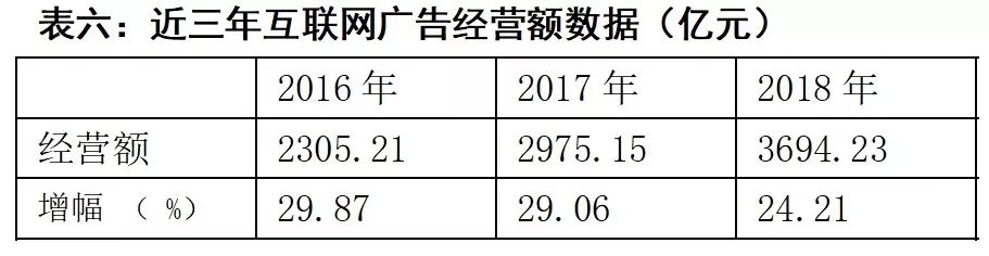 中关村互动实验室(以下简称“实验室”)数据显示,2018年互联网广告总收入为3694.23亿元,年增长率为24.2%,保持了较快的增长速度。由于中国宏观经济结构调整与去杠杆周期的影响,加之流量红利的消失,互联网广告市场整体增长较去年减缓了5.76个百分点,占GDP比重约为0.42%,较去年上升0.06个百分点,继续承载着全面拉升中国广告行业的重任(见表六)。