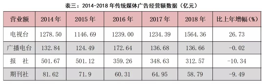 市场监管总局数据显示,2018年广播电台、报社和期刊社广告经营额分别出现了-0.02%、-10.34%和-9.49%的负增长,继续呈现下滑态势。广播电台广告收入的基本持平,主要得益于广播电台深度的互联网化,单纯广播终端成功地扩展到互联网上,实现了网台的有机联动,互为支撑;电视广告逆市而行,同比增长26.73%,远超行业预期,与广播、报社和期刊社形成巨大反差(见表三)。仅从数据上看,电视广告已成为2018年中国广告业高增长的主要动因之一。同时,电视广告的高增长,还稳住了四大传统媒体广告收入在广告总收入中的占比。这可能要得益于电视台近年来不断创新突破,适时满足了老龄人群快速增长,对消磨闲暇时间的迫切需要。但老年人喜闻乐见的健康生活类节目,近年来已少有创新,要想继续留住未来四年还将翻倍的退休老龄人群,电视台就必须不断推陈出新,深耕这块高价值市场,而不能止步于简单的“问医吃药”。
