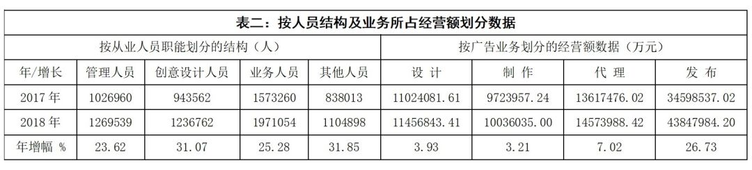 市场监管总局公布数据显示, 2018年创意设计人员增长了31.07%,超过管理人员和业务人员的增幅,这也进一步验证了行业结构调整的成效;从广告业务所占经营额比重划分看,发布经营额增幅高达26.73%,远超设计、制作和代理人员的增长。创意设计人员的高增长,反映出市场对创意创新需求的增加,是媒介碎片化、信息碎片化和信息过载的必然反映。从上述变化看,2018年中国广告的产业结构,正悄然朝着产业升级方向转化,适应市场需求,加快结构转型已成为不可逆转的发展趋势。