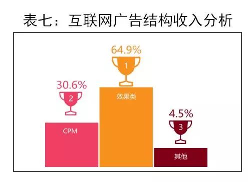 由于移动端接入流量的大幅度提高,互联网广告向移动端转移更加明显,移动端广告收入占比进一步增大至68%,较去年上升6个百分点;从媒体及平台类型看,应用型平台成为互联网最主流的广告渠道,其中,电商与搜索类型收入占比之和超过50%;从广告形式看,展示、电商与搜索类广告收入合计占比超过80%,为最主流的广告形式;从计价方式看,效果类广告迅速增长成为最主流的广告形式,广告收入占比达到64.9%(见表七)。“算法”对广告精准度和效率的提升,发挥了关键作用,提高了广告主信心,正在将互联网广告的未来带向多寡头的格局。