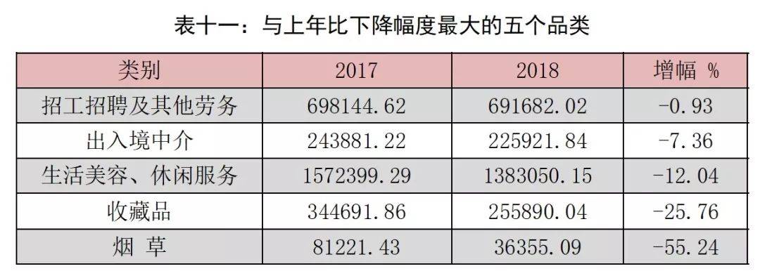 市场监管总局数据显示,2017年降幅最大的五大品类中,烟草类、收藏品类和出入境中介类在2018年再次入选。不过,出入境中介在互联网领域的投放势态不错。生活美容、休闲服务类,由2017年10.18%正增长,到2018年负增长12.04%,跌幅超过22个百分点,这与该行业的创新力不足不无关系(见表十一)。