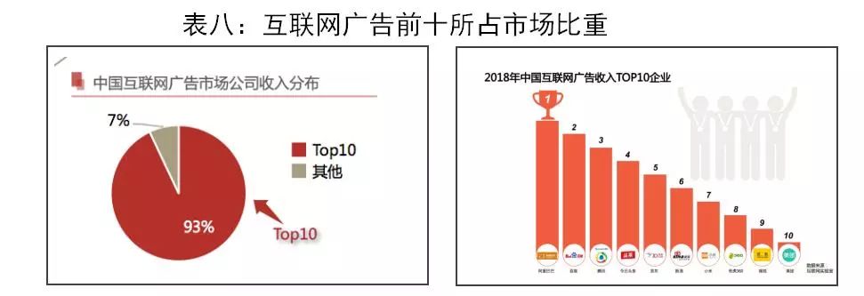 2018年是中国互联网营销全面创新升级,不断推陈出新的一年。新技术替代传统互联网营收产品,以今日头条、小米、美团为代表的新生力量的迅速崛起,拉动了互联网广告的持续增长。他们依靠创新的业务模式、产品及技术优势,为互联网广告增长植入了新动力。新生力量的崛起使互联网广告市场的竞争更加激烈,也促使头部媒体和平台的市场集中度更高,广告经营额前十的互联网公司占比由2017年的90.92%上升至2018年的92.67%(见表八);但是BAT三家占互联网广告收入的份额相较2017年却下降了2个百分点,占有率回落到69%。
