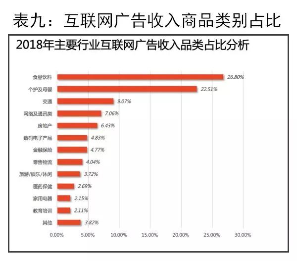 实验室数据显示,2018年快消品仍然是互联网广告投放最主要的品类。食品饮料品类广告收入稳坐广告品类的头把交椅,个护及母婴品类位居第二,这两项之和依然占比达到49.31%;交通、网络通讯及房地产类分列3-5位,收入占比均超过6%,较上年收入增幅均超过15%;数码电子产品、金融保险、零售物流类收入增幅均超过20%,分列6-8位;医药保健品类呈现负增长,占比降至2.69%。排在前十位的品类占据了广告收入的91.92%(见表九)。