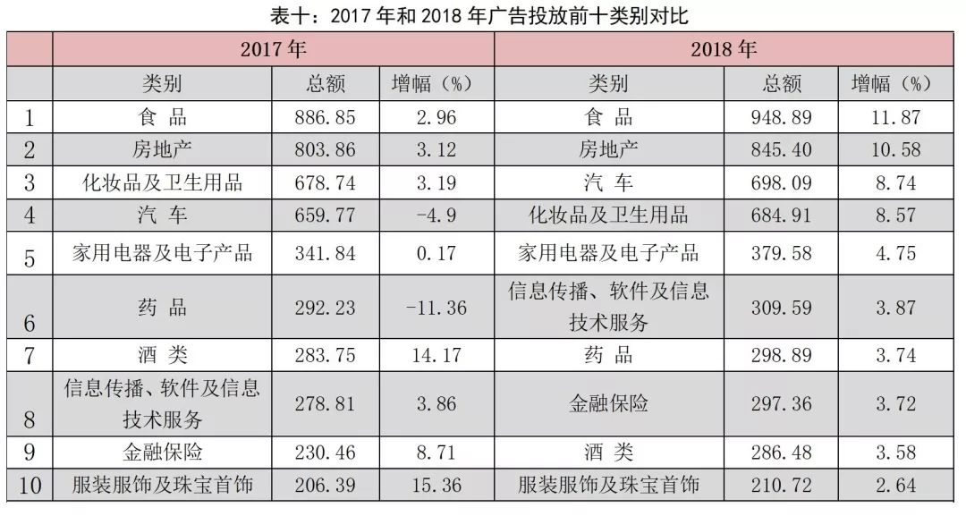 市场监管总局数据显示,前十大品类广告投放的增长强劲。食品类同比增长11.87%,房地产类增幅10.58%,汽车类是8.74%, 化妆品及卫生品类8.57%,与上一年相比都有较大幅度的增长。尤其是汽车类从4.9%负增长到8.74%的正增长,增长了13.64个百分点,食品类的增幅也接近了9%。两个食品类别,分别代表消费者大件支出和民生类必需品。这其中预示的含义值得关注(见表十)。