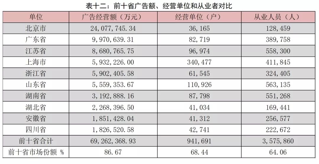 数据还显示,前十省占据广告经营市场总额的86.67%,但只占总经营单位的68.44%和人员总数的64.06%,人均产值19.37万元。后十省只占广告经营市场总额的1.49%,人均产值3.35万元。以规模计,排在前十省区的总额是后十省区的58倍多。但是,按人均产值计,前十省区是后十省区的约5.8倍。从发达地区和发展地区人均产值看,双方差距并不像总额数据那么显著,远远超出人们的预料。消费市场的持续下沉,将会拉动发展中地区新一轮广告业的崛起。