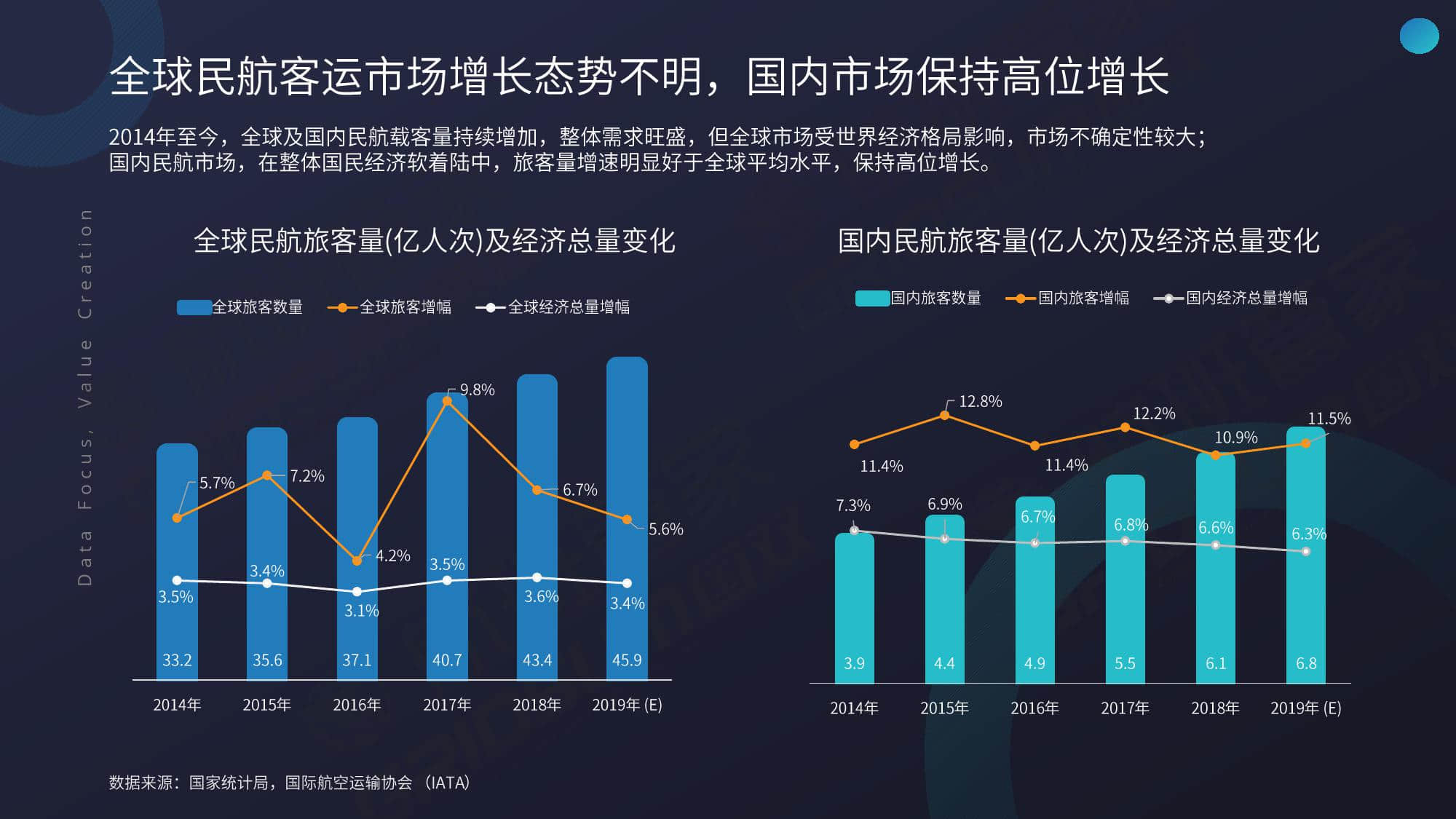 2014年至今,全球及国内民航载客量持续增加,整体需求旺盛,但全球市场受世界经济格局影响,市场不确定性较大;而国内民航市场,受益于整体国民经济软着陆,旅客量增速明显好于全球平均水平,保持高位增长。
