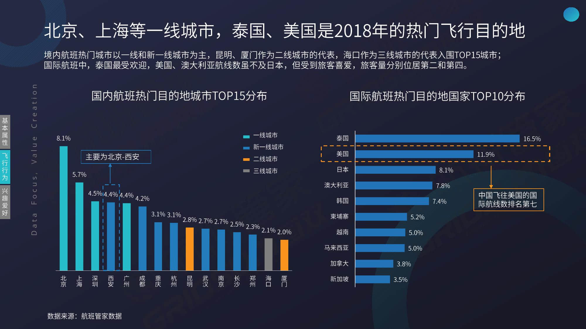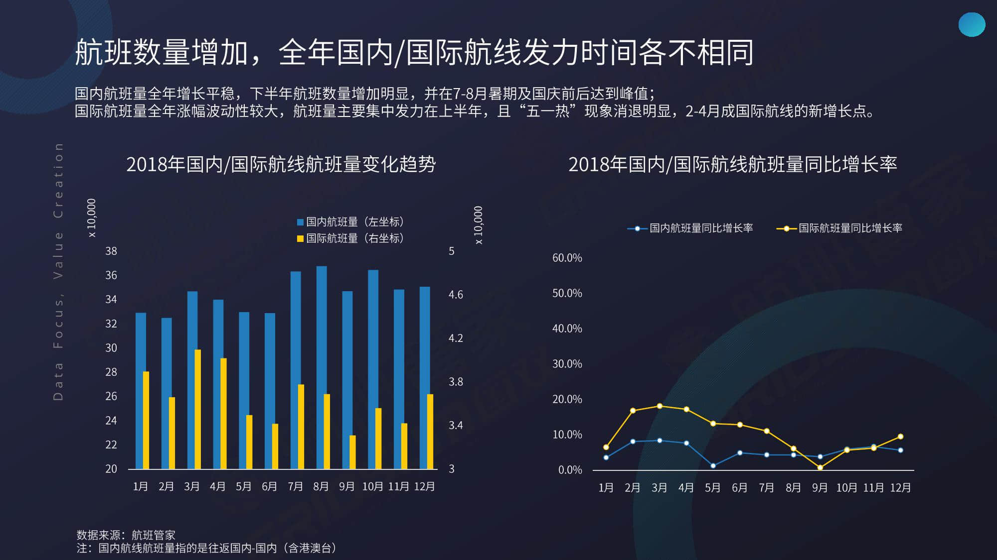 - 2018年国内航班量全年增长平稳,在7-8月暑期及国庆前后达到峰值;而国际航班量全年涨幅波动性较大,2-4月成为国际航线的新增长点;