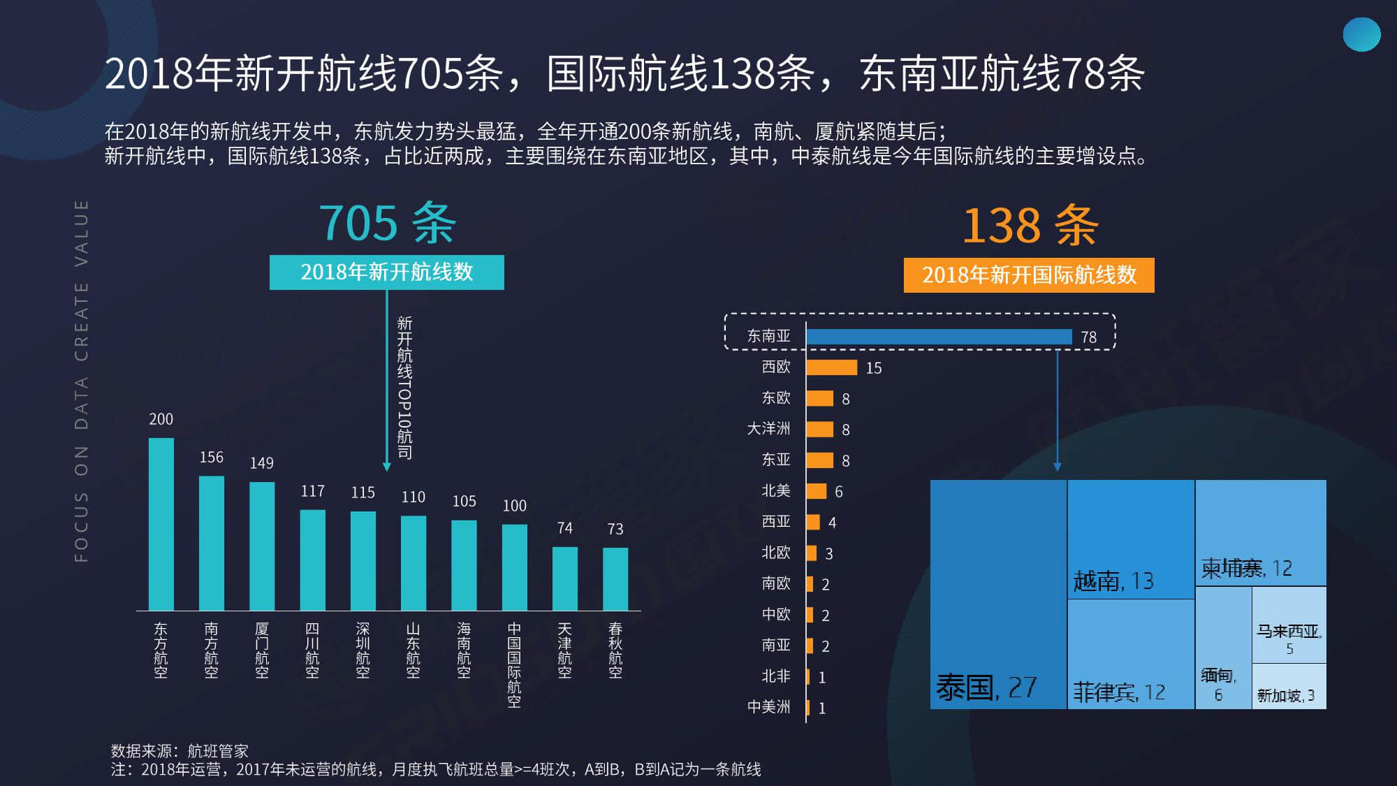 - 2018年新开航线共计705条,国际航线138条,东南亚航线78条;