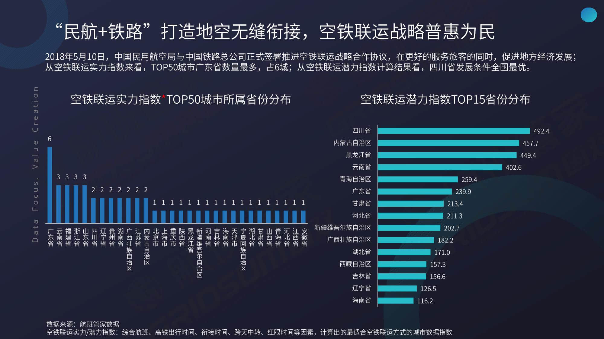 - 在民航与铁路联运方面,从空铁联运实力指数来看,TOP50城市中广东省数量最多,占6城市;从空铁联运潜力指数来看,四川发展条件全国最优;