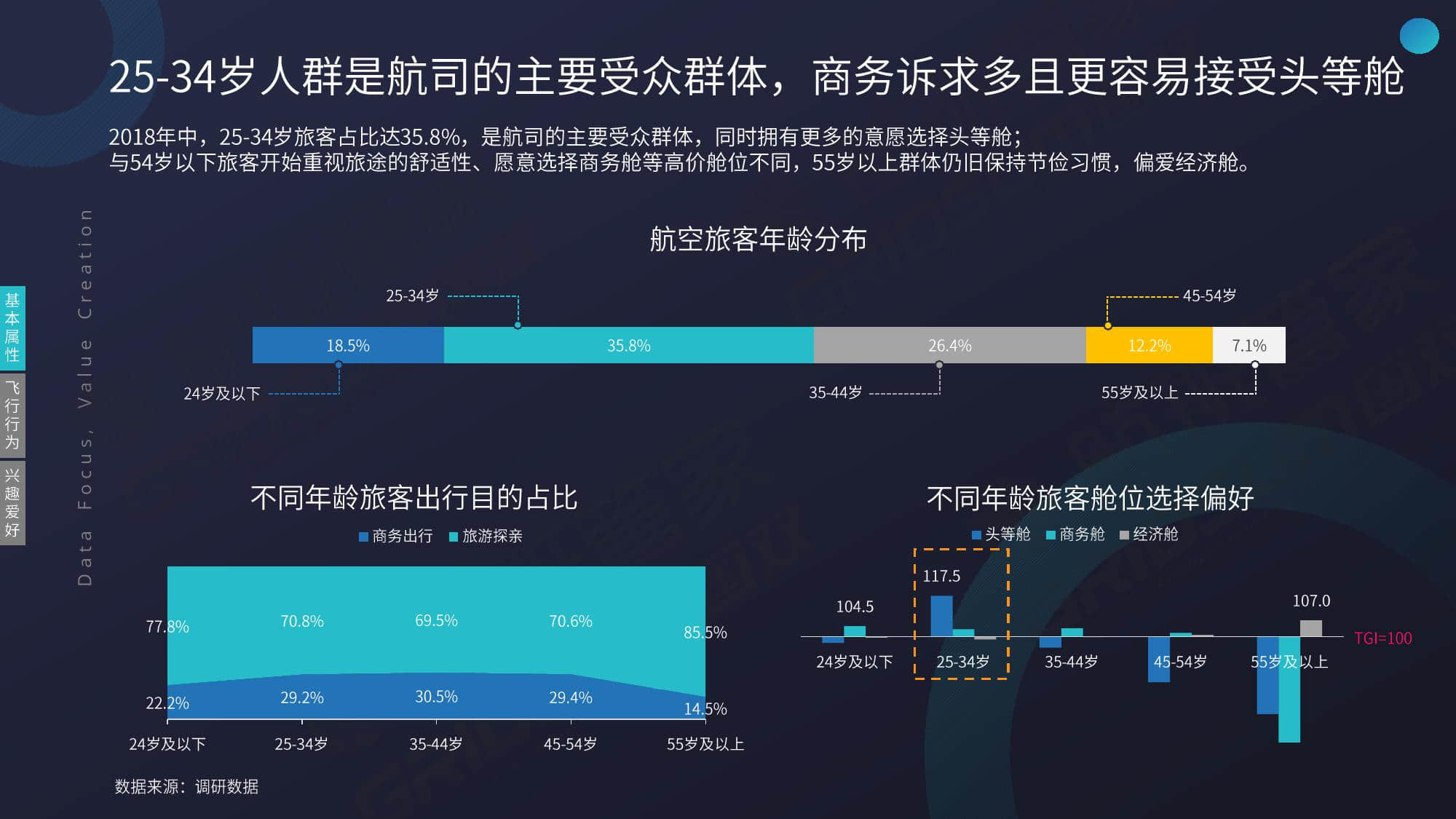 在年龄方面,25-34岁旅客占比达35.8%,是航司的主要受众群体,同时拥有更多的意愿选择头等舱;与54岁以下旅客开始重视旅途的舒适性、愿意选择商务舱等高价舱位不同,55岁以上群体仍旧保持节俭习惯,偏爱经济舱。