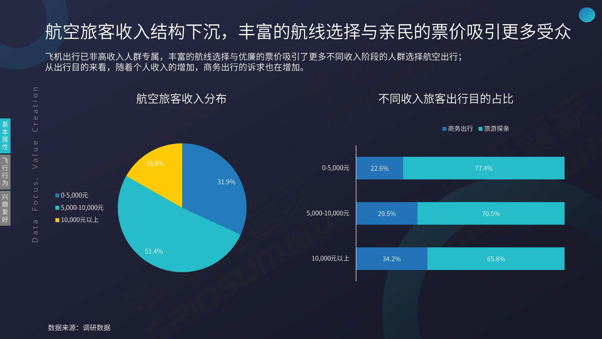 从收入方面分析,飞机出行已非高收入人群专属,丰富的航线选择与优廉的票价吸引了更多不同收入阶段的人群选择航空出行;从出行目的来看,随着个人收入的增加,商务出行的诉求也在增加。