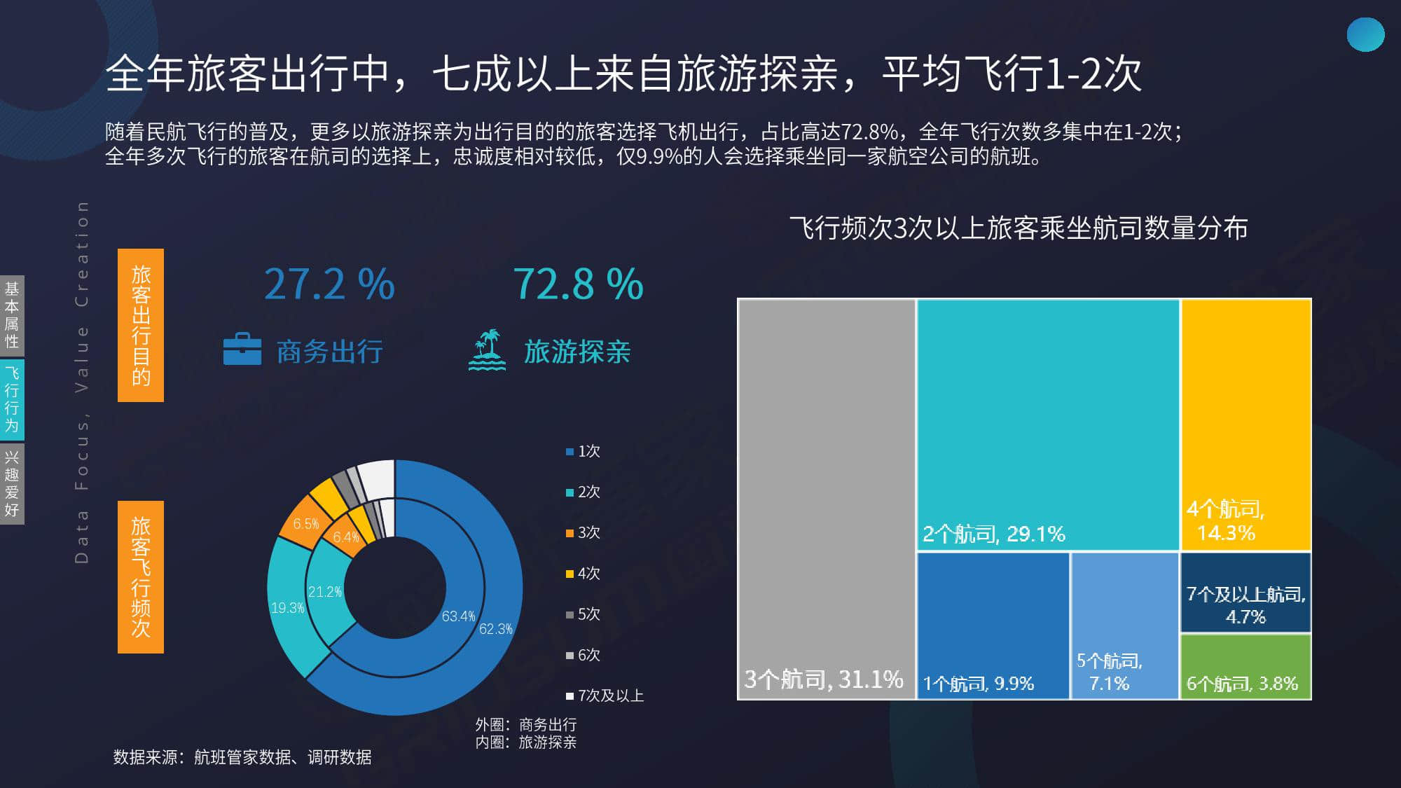 - 国人全年飞行次数达1亿次,七成以上来自旅游探亲;但航司品牌忠诚度较低,仅9.9%的人会选择乘坐同一家航司的航班;