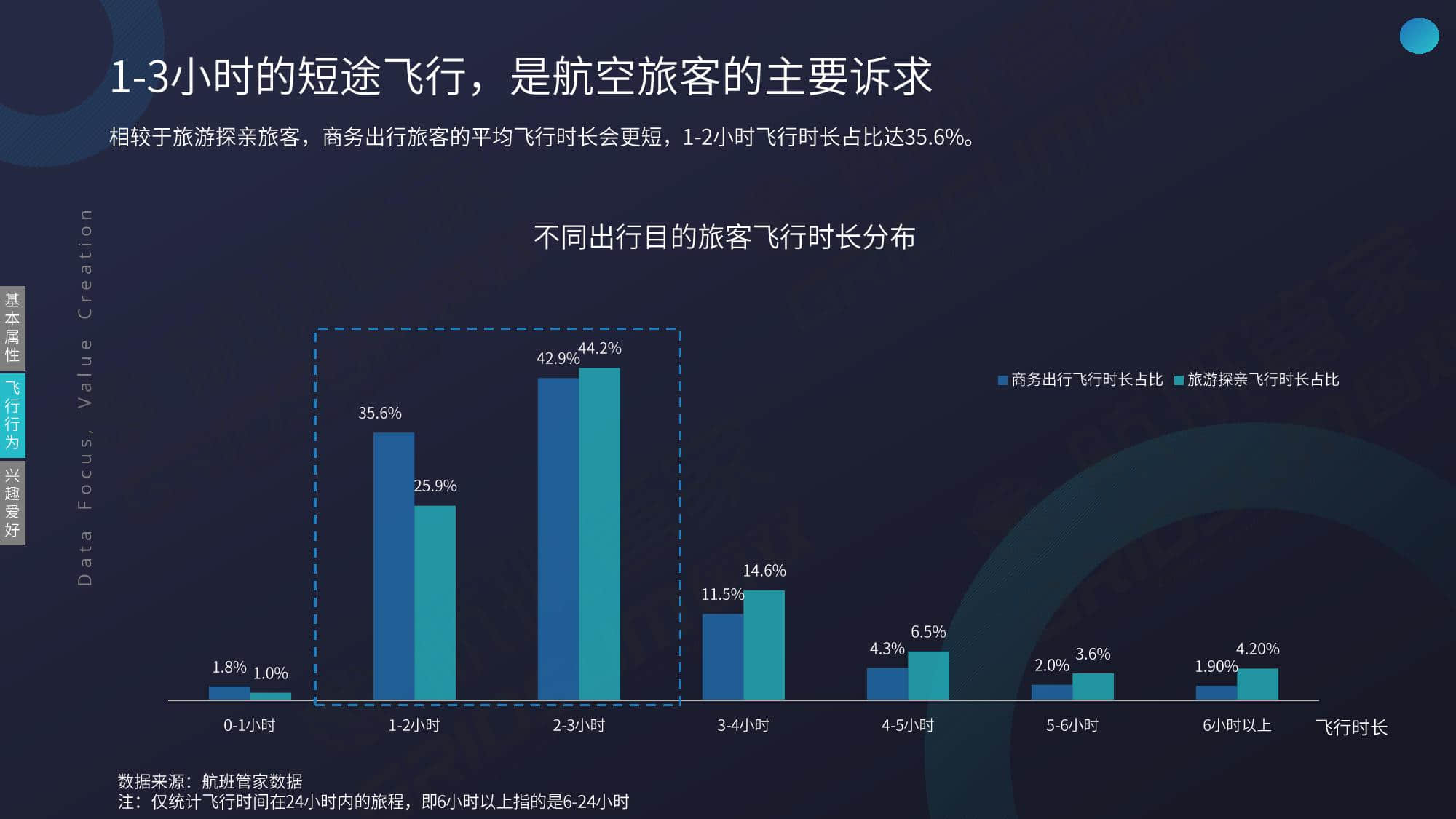 在飞行时间方面,1-3小时的短途飞行,是航空旅客的主要诉求。相较于旅游探亲旅客,商务出行旅客的平均飞行时长会更短,1-2小时飞行时长占比达35.6%。