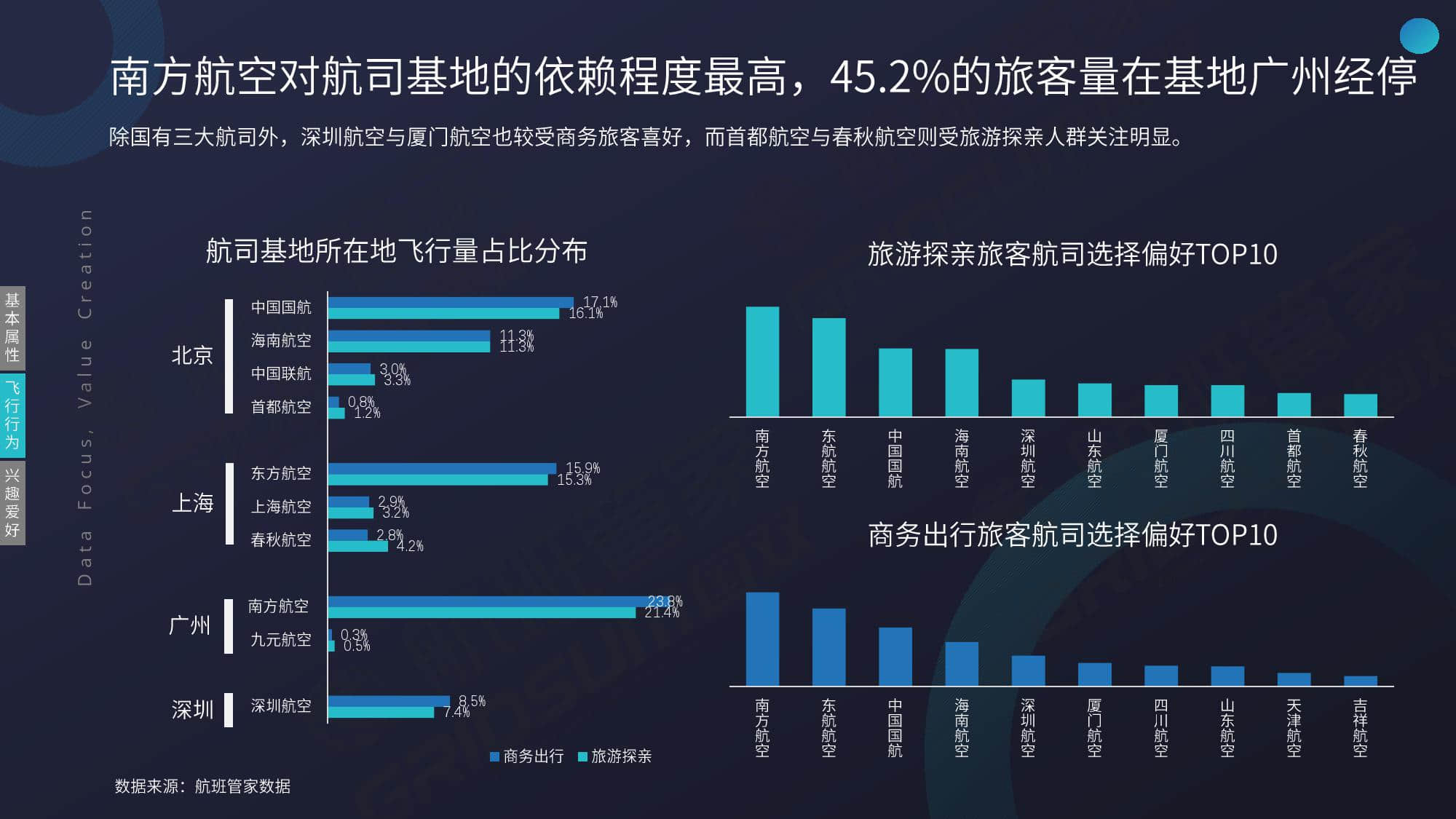 在航司偏好方面,除国有三大航司外,深圳航空与厦门航空也较受商务旅客喜好,而首都航空与春秋航空则受旅游探亲人群关注明显。