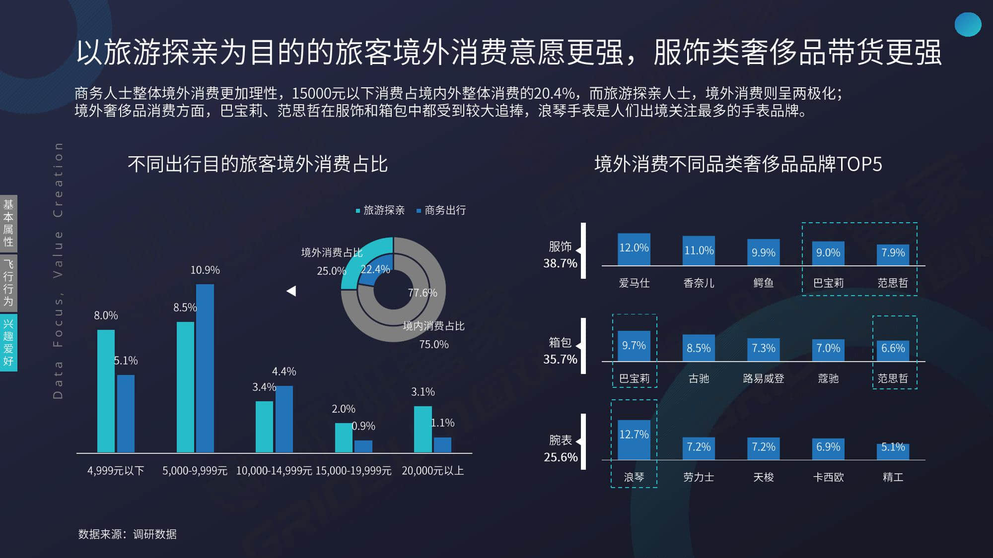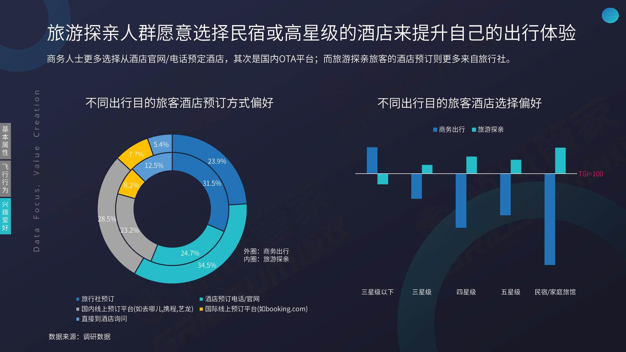 - 以旅游探亲为目的的旅客,在境外消费意愿更强,也更愿意选择民宿或高星级的酒店来提升自己的出行体验;