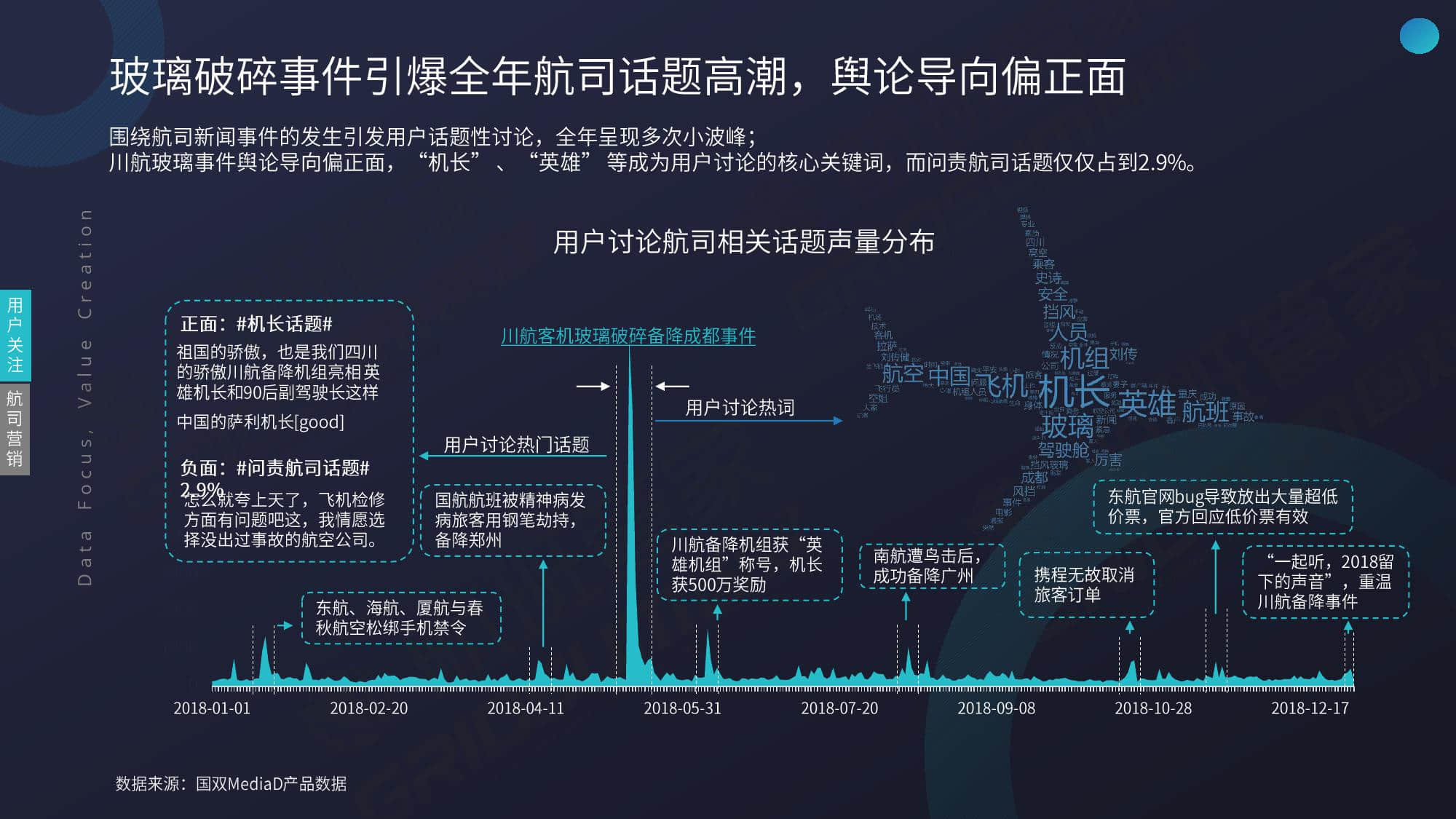 其中,川航玻璃破碎事件引爆全年航司话题高潮,舆论导向偏正面,“机长” 、“英雄” 等成为用户讨论的核心关键词,而问责航司话题仅仅占到2.9%。