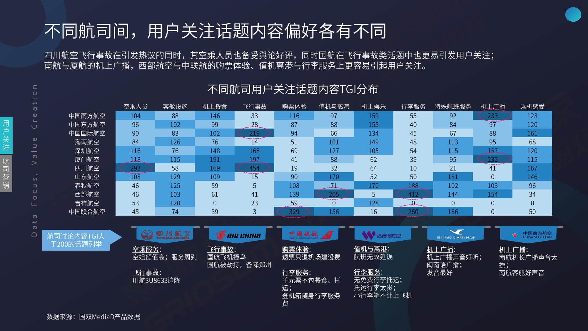 - 不同航司间,用户关注话题内容偏好各有不同;