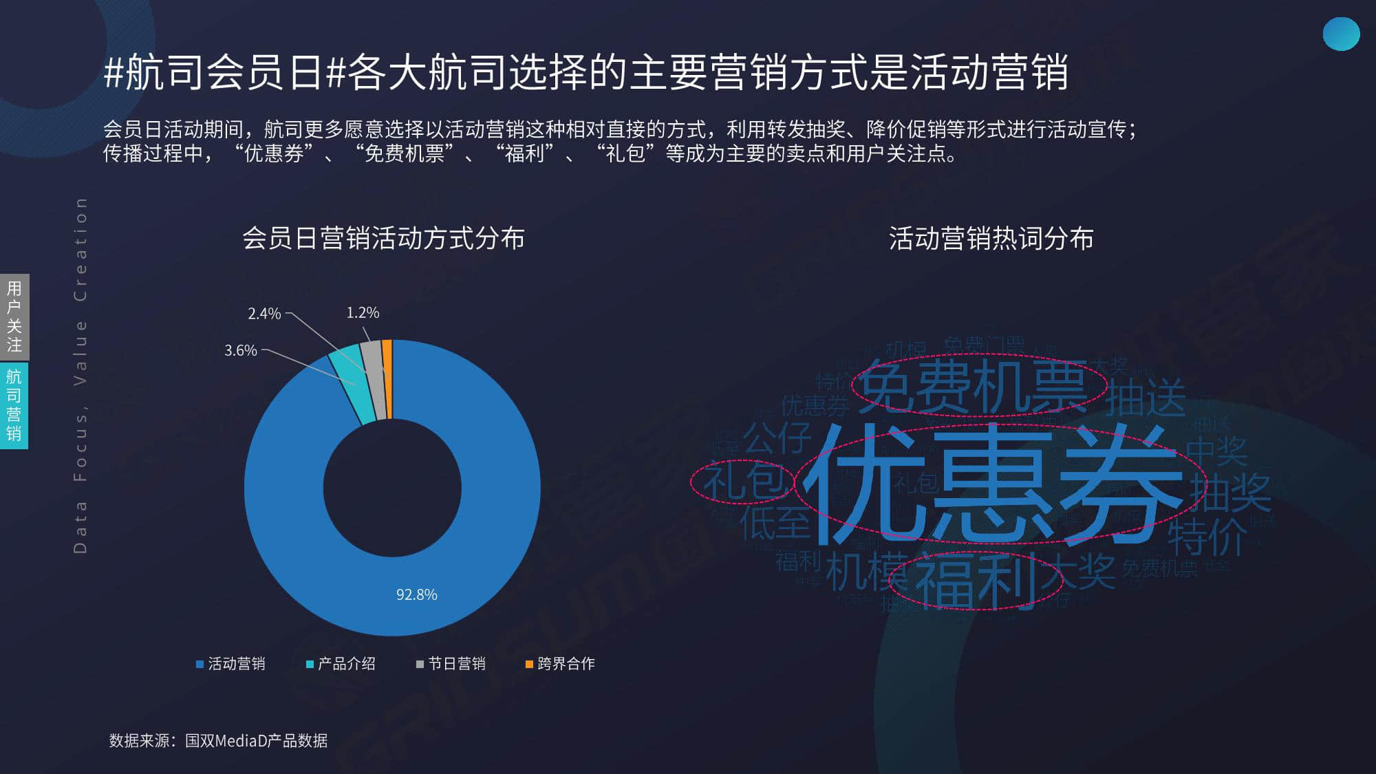 在航司会员日期间,航司更多愿意选择以活动营销这种相对直接的方式,利用转发抽奖、降价促销等形式进行活动宣传;传播过程中,“优惠券”、“免费机票”、“福利”、“礼包”等成为主要的卖点和用户关注点。