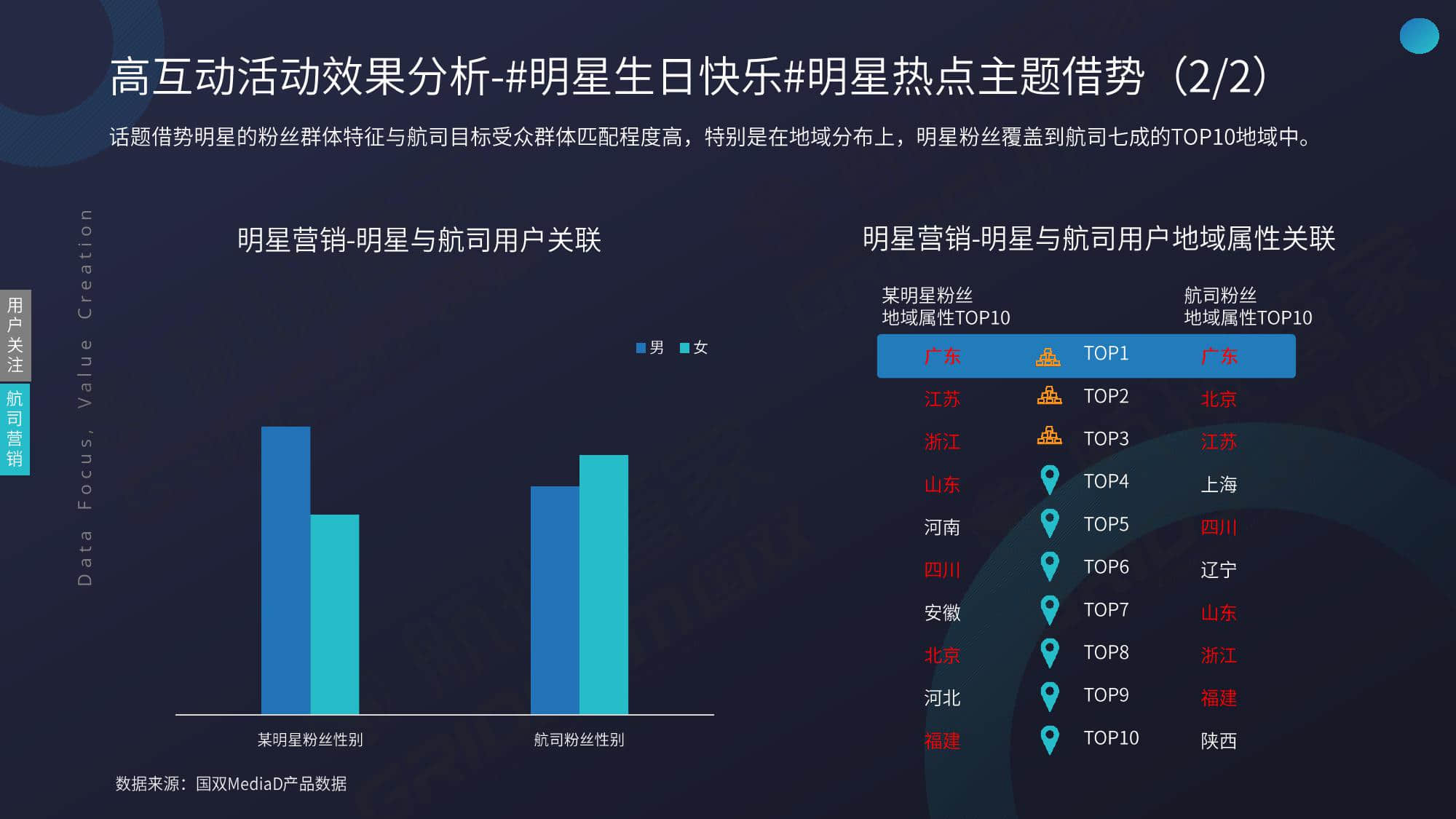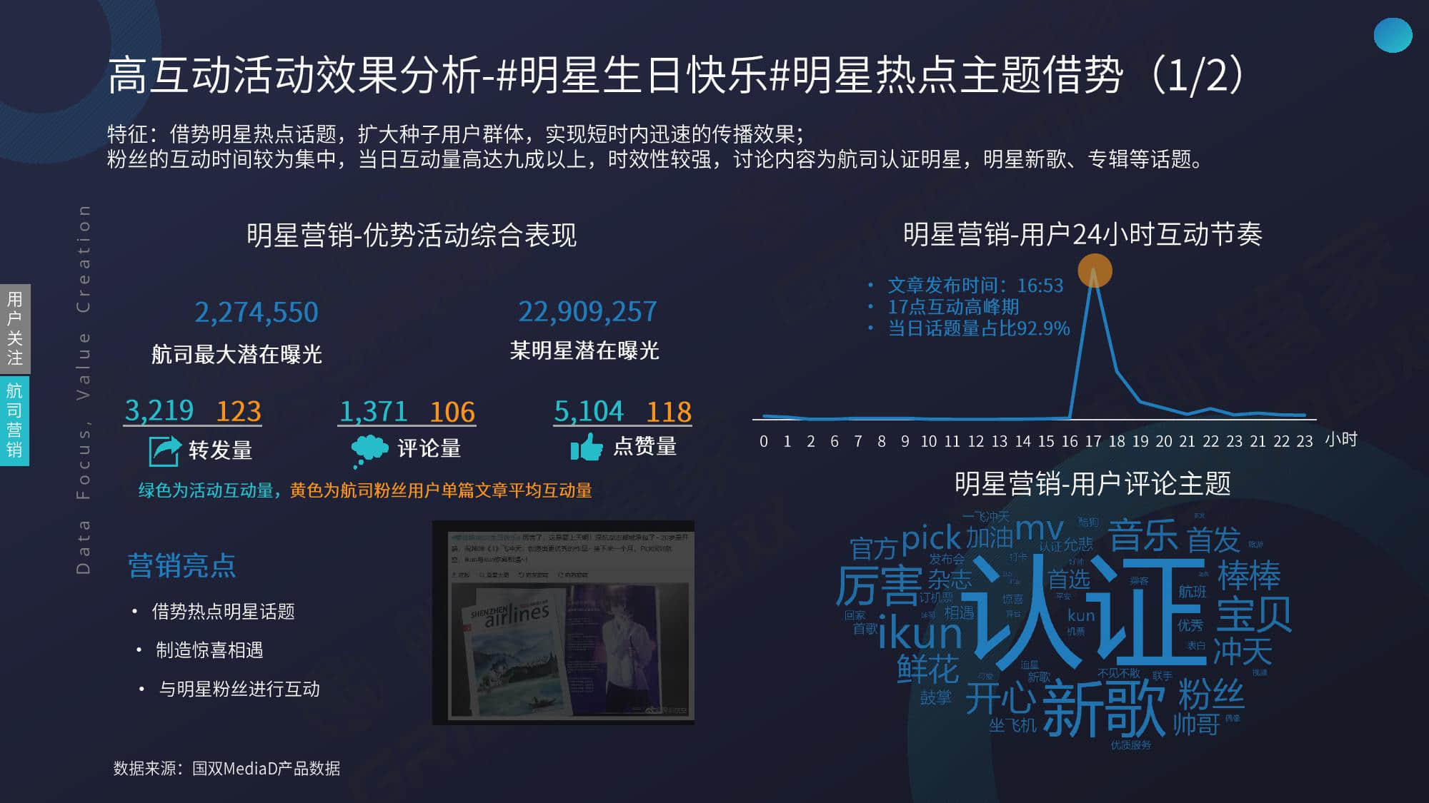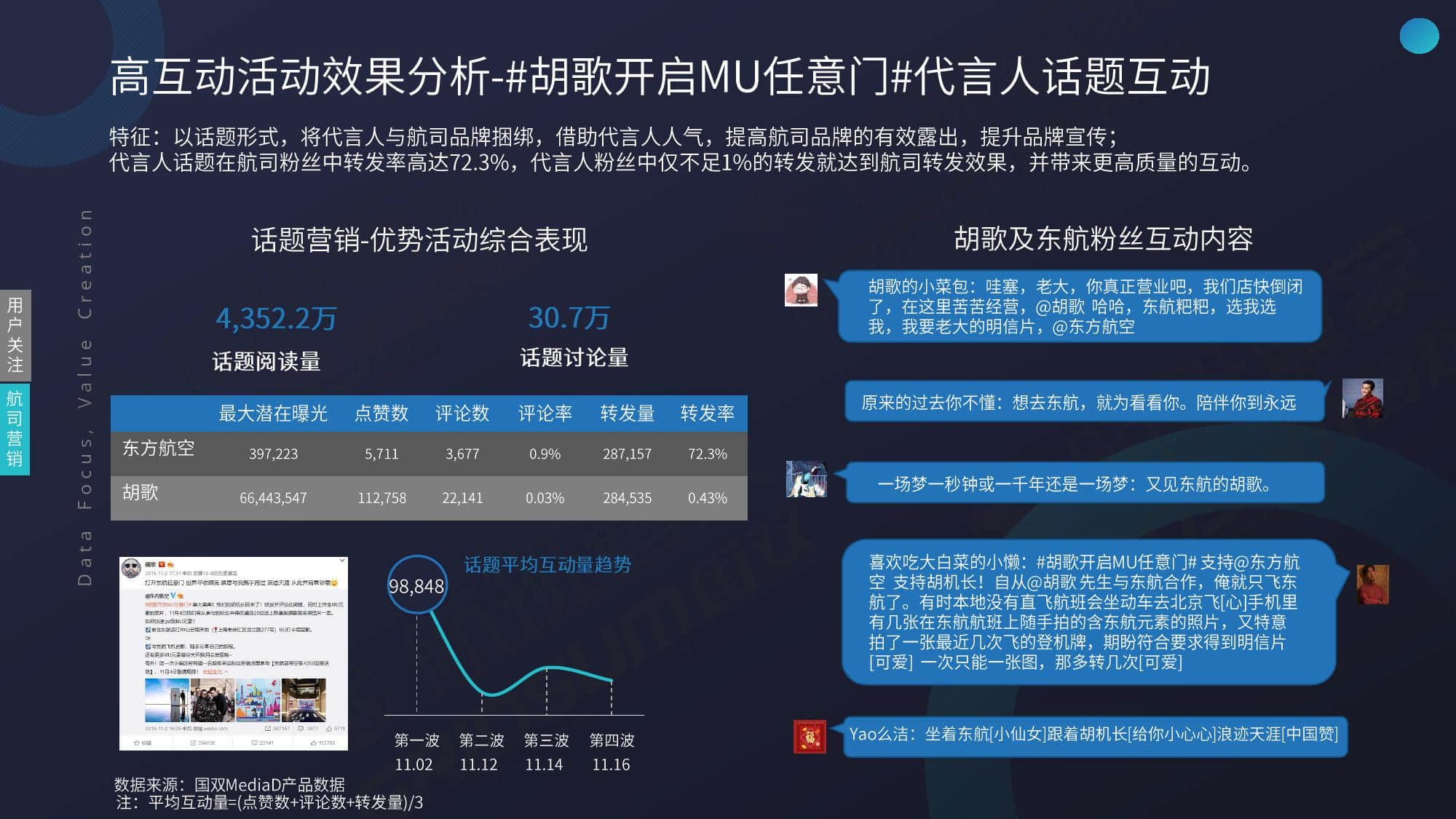 明星营销,以东航#胡歌开启MU任意门#为例,借助话题形式,将代言人与航司品牌捆绑,提高航司品牌的有效露出,提升品牌宣传。代言人话题在航司粉丝中转发率高达72.3%,代言人粉丝中仅不足1%的转发就达到航司转发效果,并带来更高质量的互动。