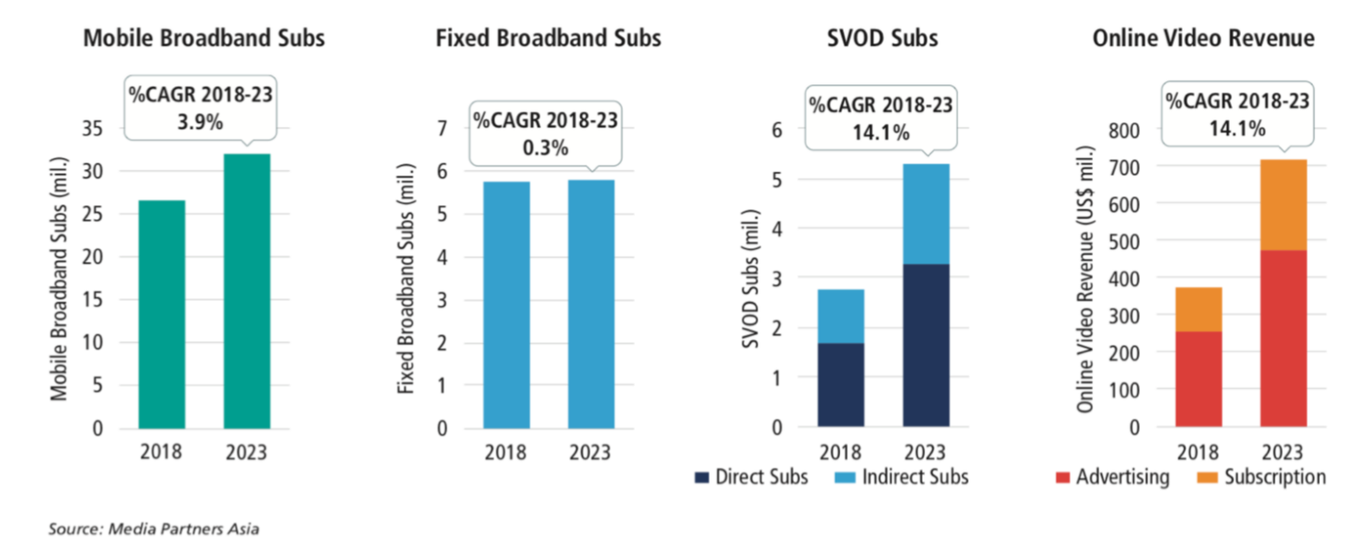 根据Media Partners Asia(MPA)的数据,16个亚太地区市场在线视频广告和订阅收入将从2019年的260亿美元增长到2024年的520亿美元,复合年均增长率(CAGR)为15%。