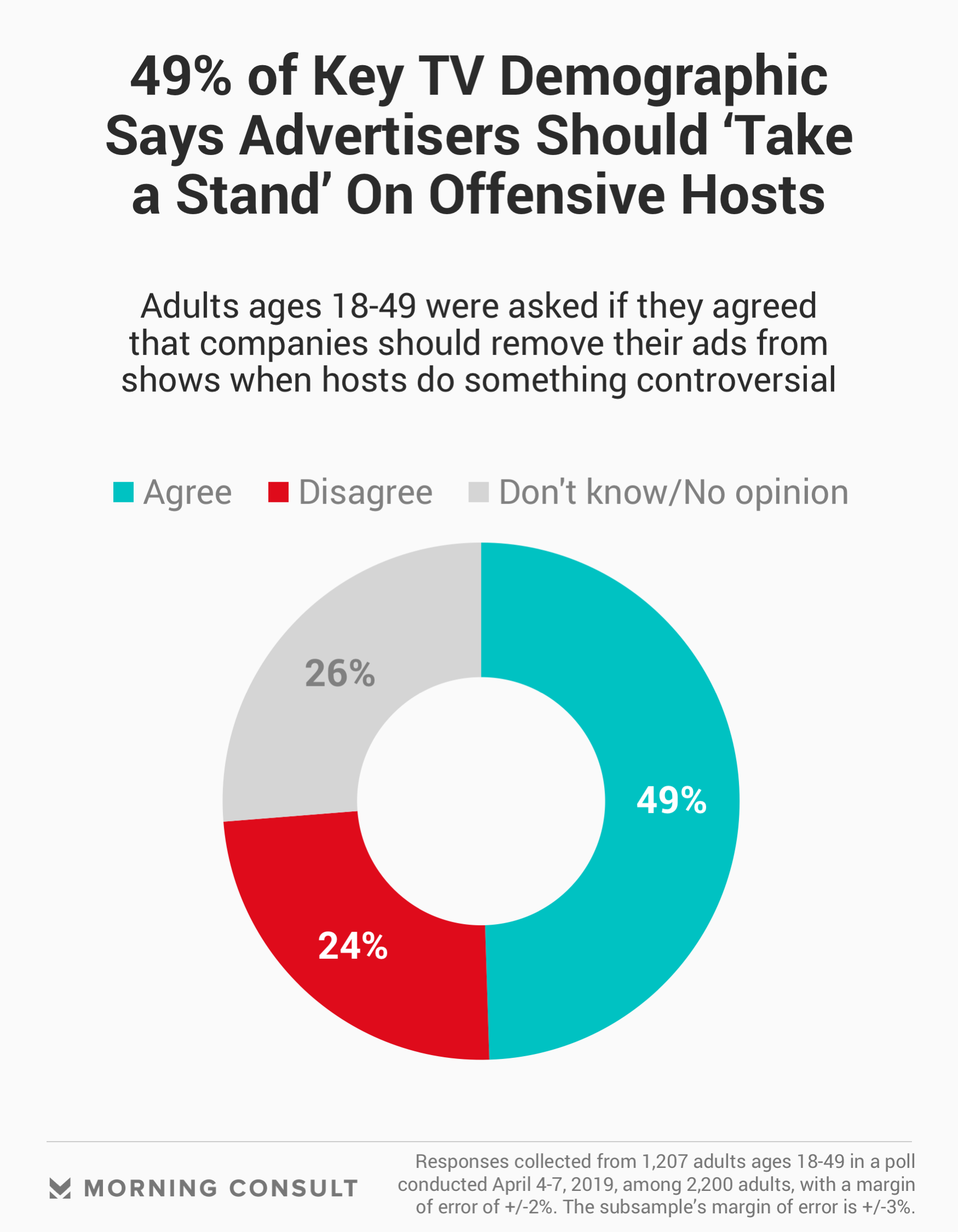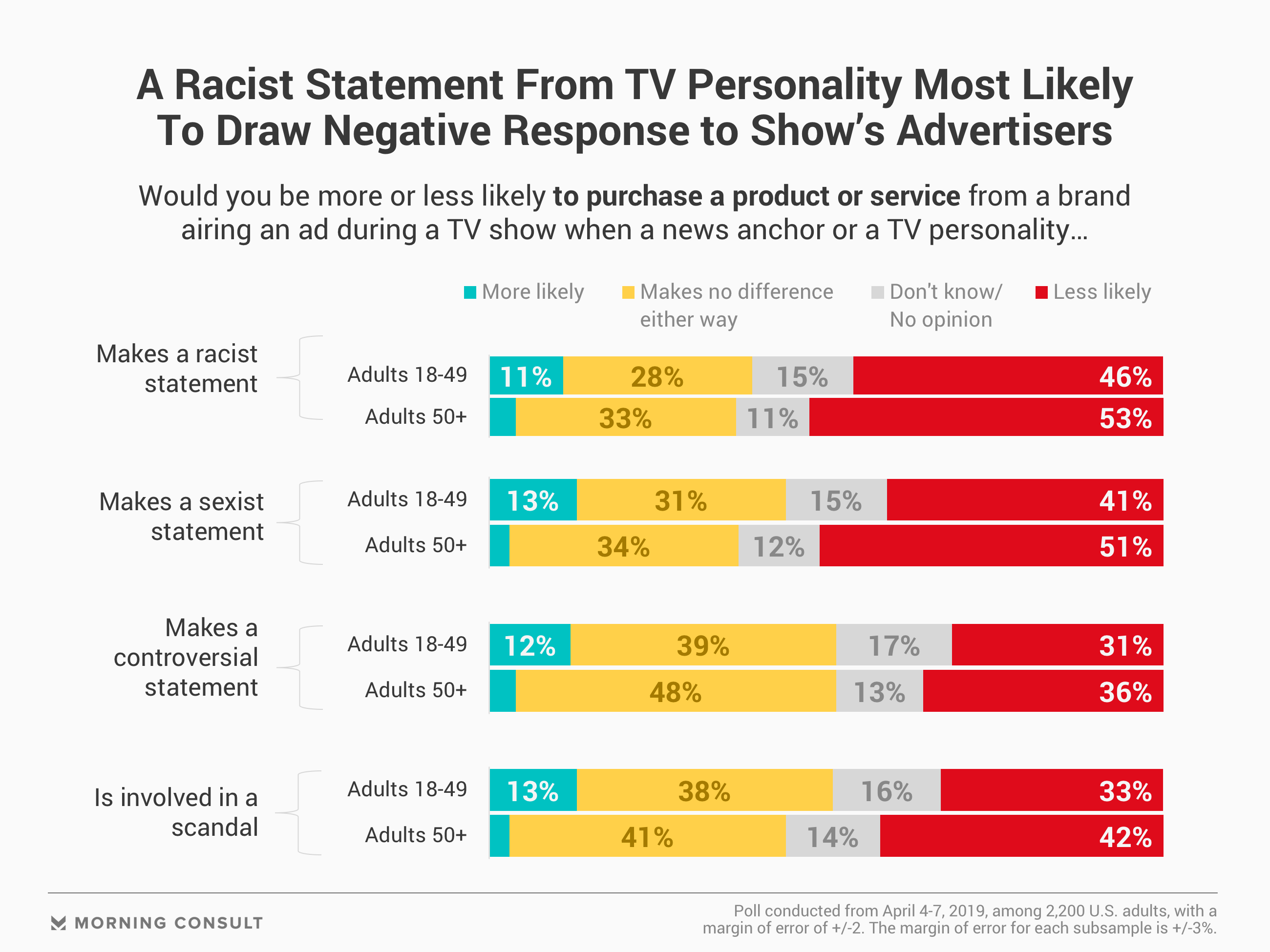 Morning Consult/Hollywood Reporter对2200名成年人进行的调查发现,59%的50岁以上美国人表示,当主持人说或做有争议或冒犯的事情时,公司应该采取行动从节目中删除他们的广告。不到一半的18-49岁成年人(49%)也这样认为。