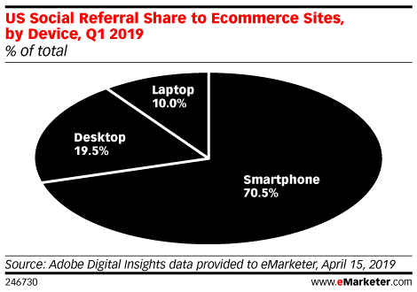 社交网络仅代表电子商务推荐的一小部分,但他们在购买途径中的角色越来越重要。作为最后一次接触的渠道,过去两年社交网络的访问份额增加了一倍。根据Adobe Digital Insights 2019年第一季度的数据,绝大多数社交网络推荐来自智能手机。