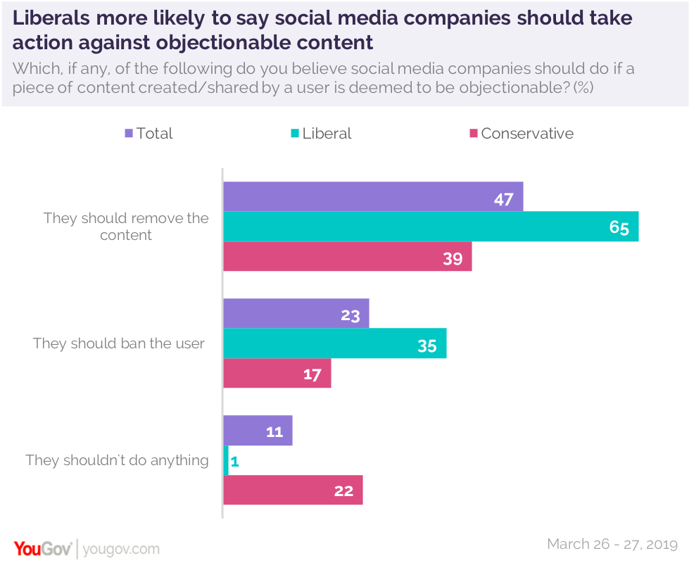 接近一半的美国人(47%)表示如果用户创建的内容被认为是令人反感的,社交媒体公司应该删除内容。近1/4的受访者(23%)表示应该禁止这样的用户。