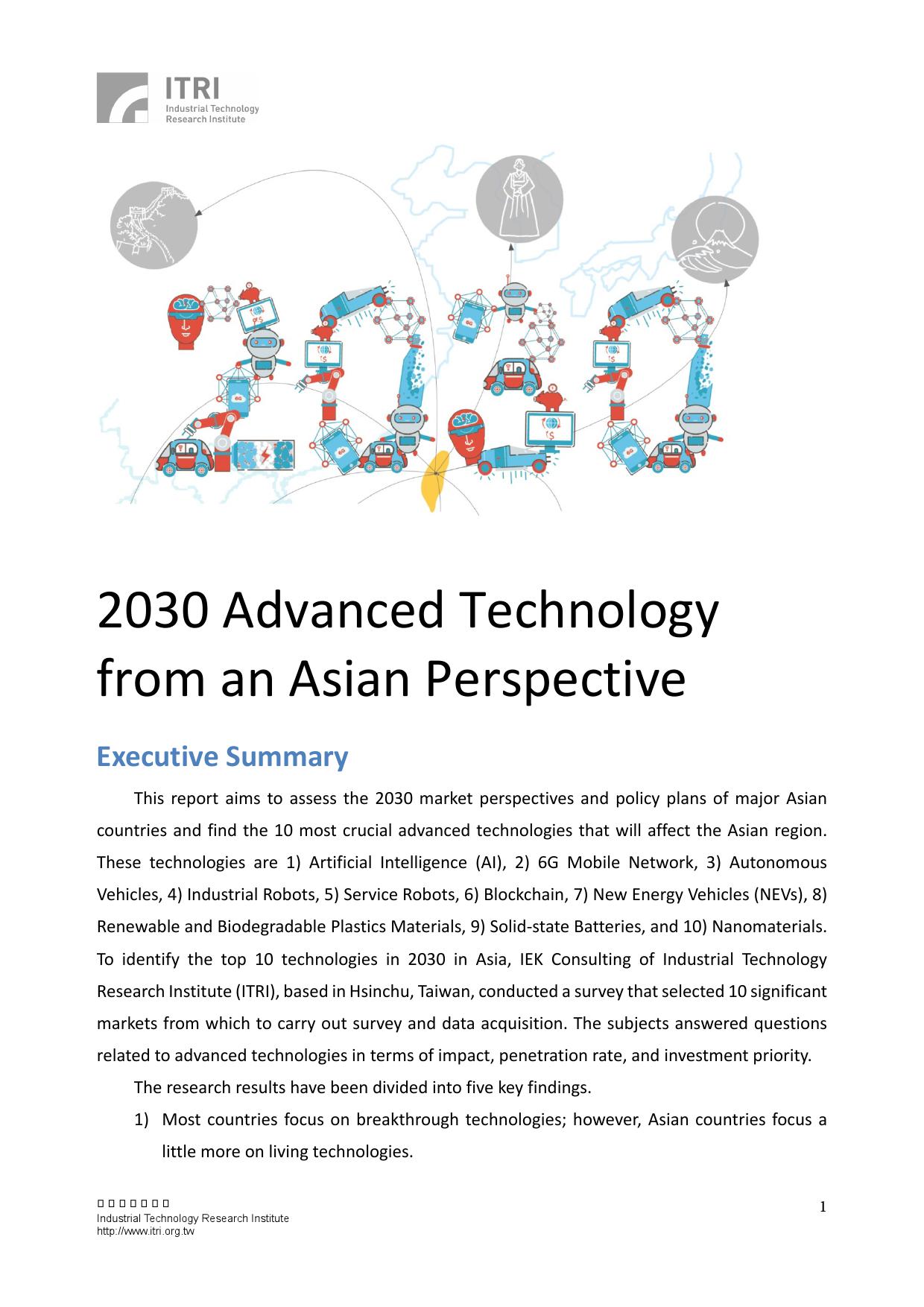 工业技术研究院(以下简称“工研院”)产业科技国际策略发展所(IEK)新发布了一份报告,这份新报告对亚洲主要国家到2030年的市场前景和政策计划进行了评估,并列出了到2030年将影响亚洲地区的10项最关键的先进技术。