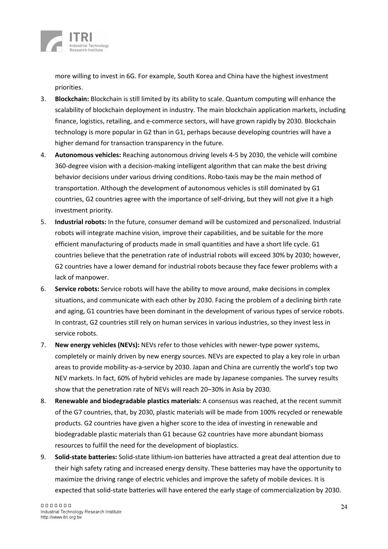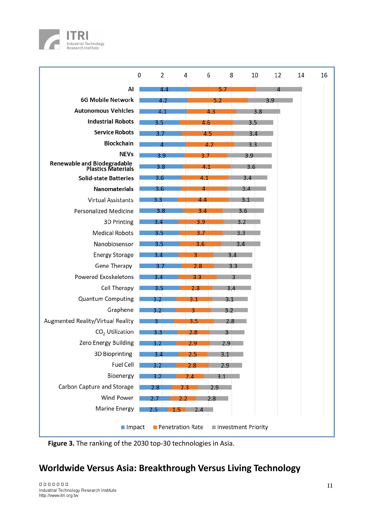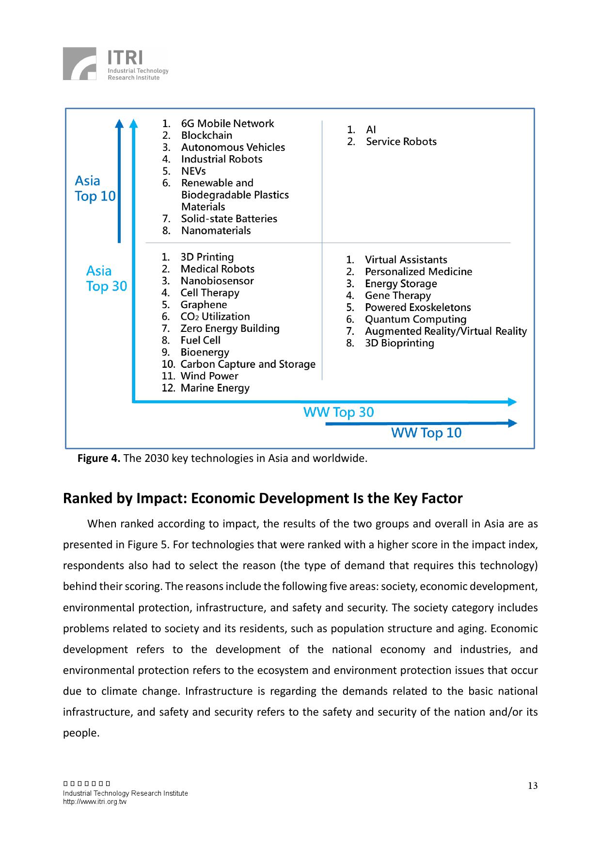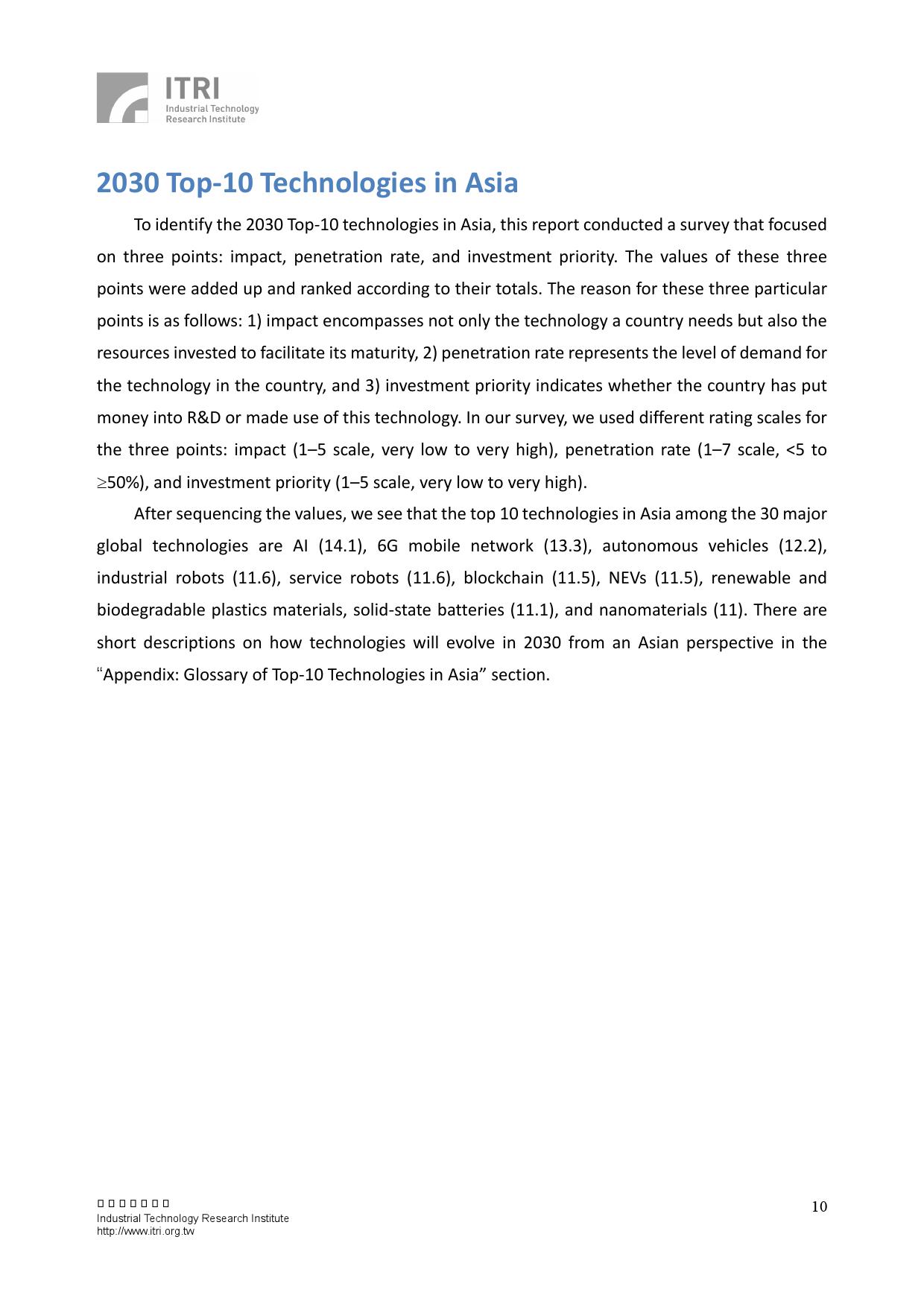 为了识别出这十大技术,位于台湾新竹的工研院产业科技国际策略发展所选择了10个重要市场进行了调查和数据采集。受访者在影响、渗透率和投资优先级等方面回答了与先进技术相关的问题。