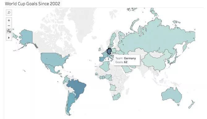在这个例子中,我们可以看到各国在2002年世界杯前后的表现。德国队进球最多,是世界足球史上最具统治力的球队之一。