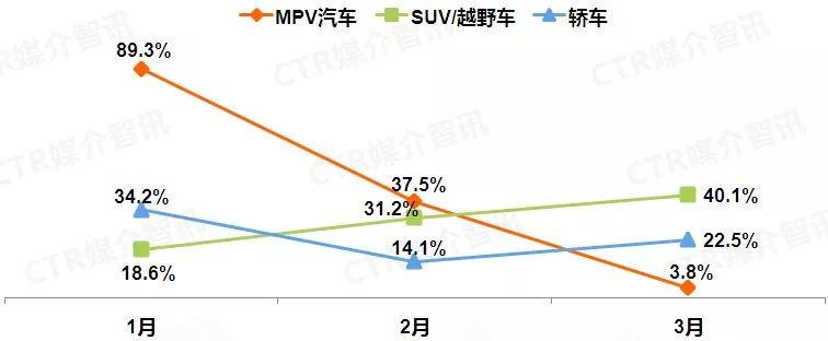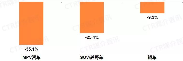根据CTR媒介智讯广告监测数据显示,三大乘用车品类广告刊例花费均呈现负增长,MPV汽车和SUV/越野车降幅均达二位数。