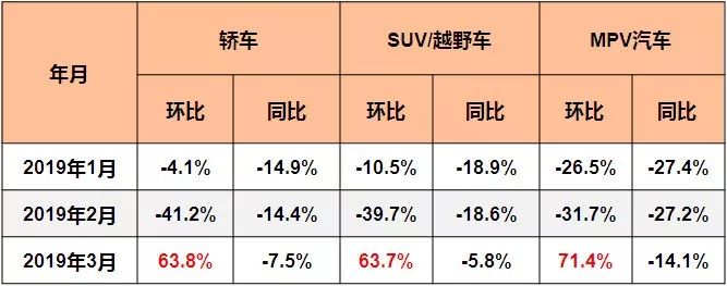 根据中国汽车工业协会的数据显示,2019年3月,三大类乘用车品类销量环比均呈现较快增长;销量同比持续下降,但降幅均有所收窄。