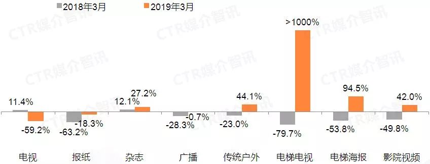 2019年3月,乘用车在电梯电视的广告花费同比增长最为突出,电梯海报和影院视频的增幅也有较大的提升,分别为94.5%和42.0%。传统媒体中,传统户外媒体和杂志的刊例花费增幅较上月均有所扩大,分别为44.1%和27.2%。