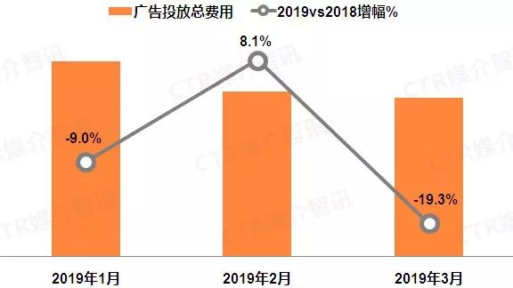 根据CTR媒介智讯广告监测数据显示,2019年3月乘用车全媒体广告投放经历2月份微涨后,同比重现负增长,降幅为19.3%;环比降幅继续收窄,仅为3.8%。