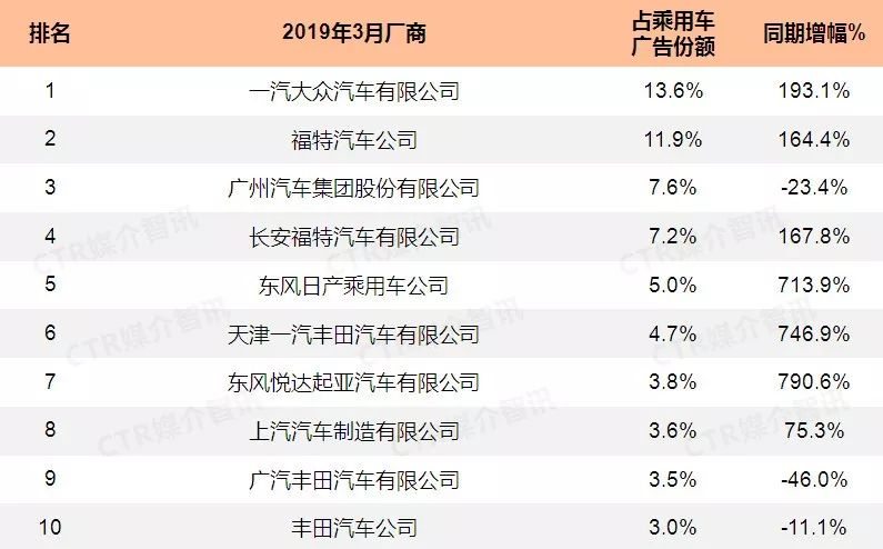 2019年3月乘用车广告投放份额TOP10厂商