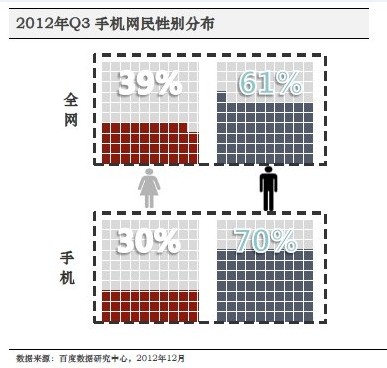 手机网民中男性占比高于全网9个百分点,表明男性群体对手机这种通讯产品的兴趣更加浓厚。