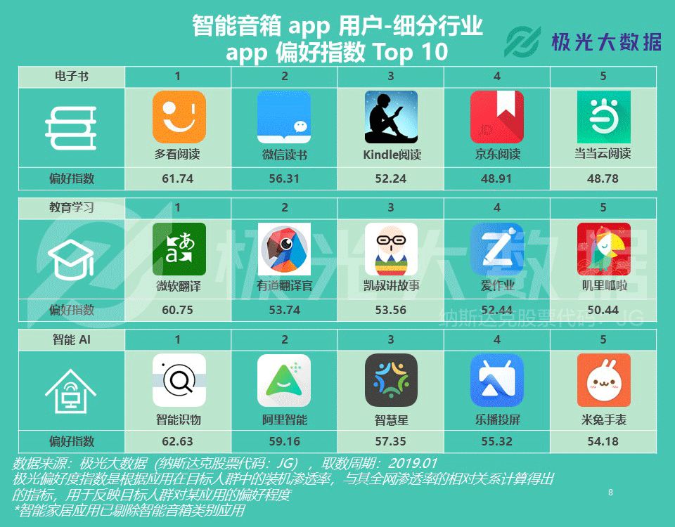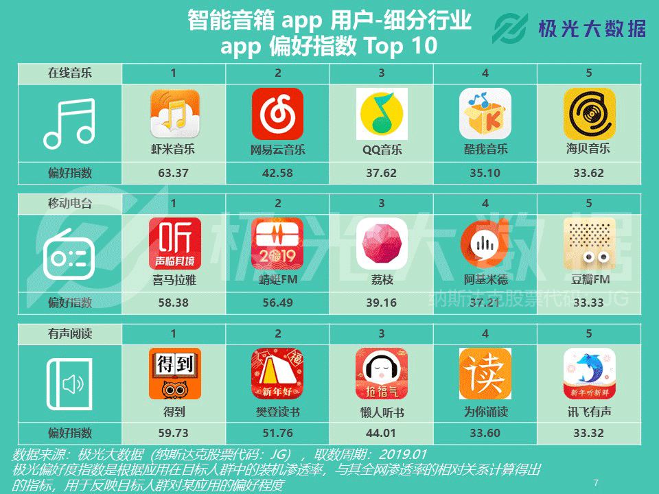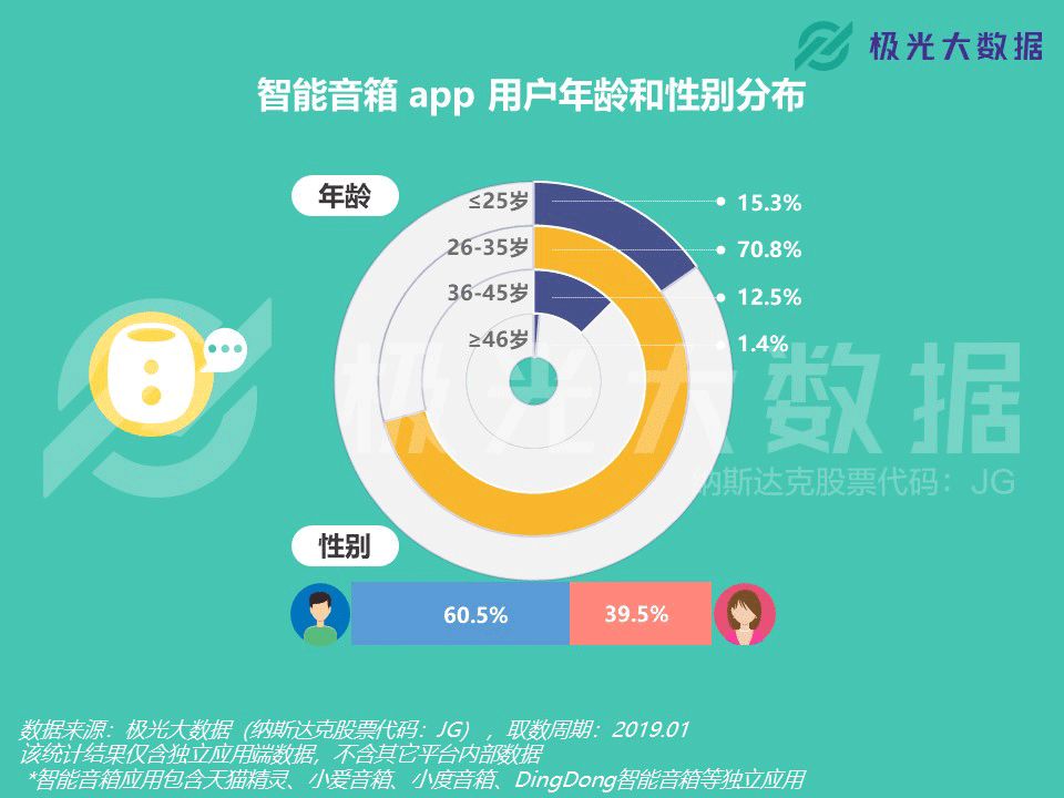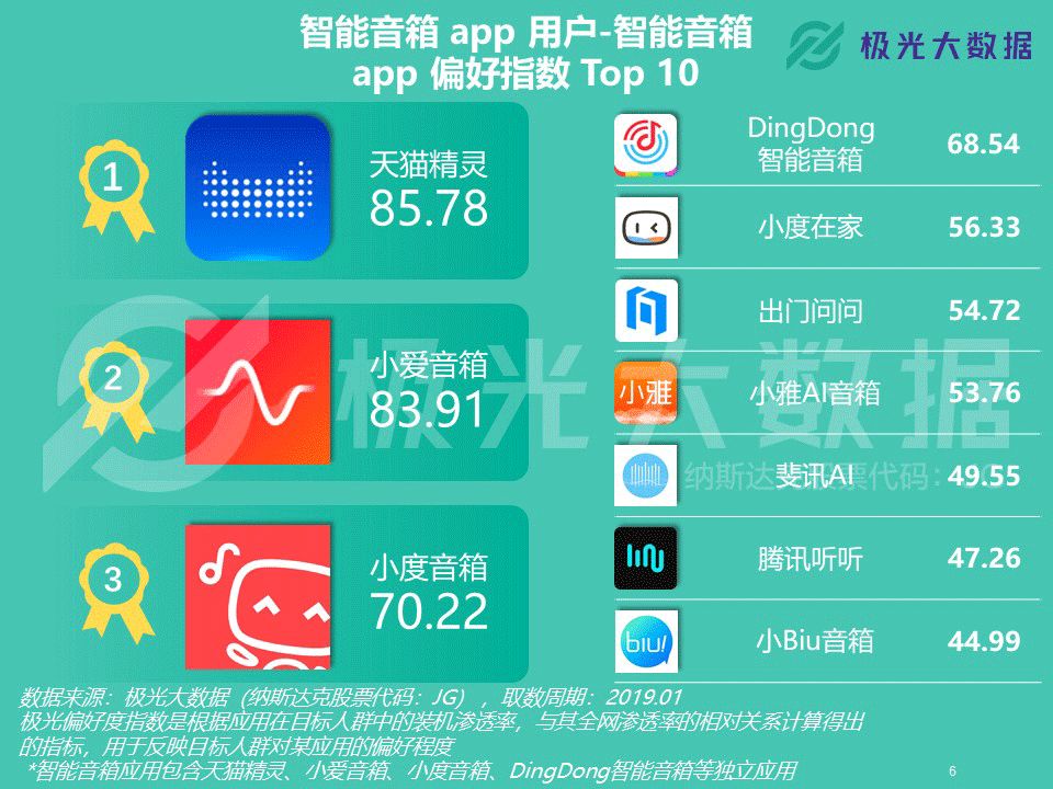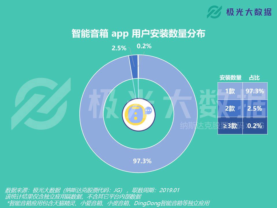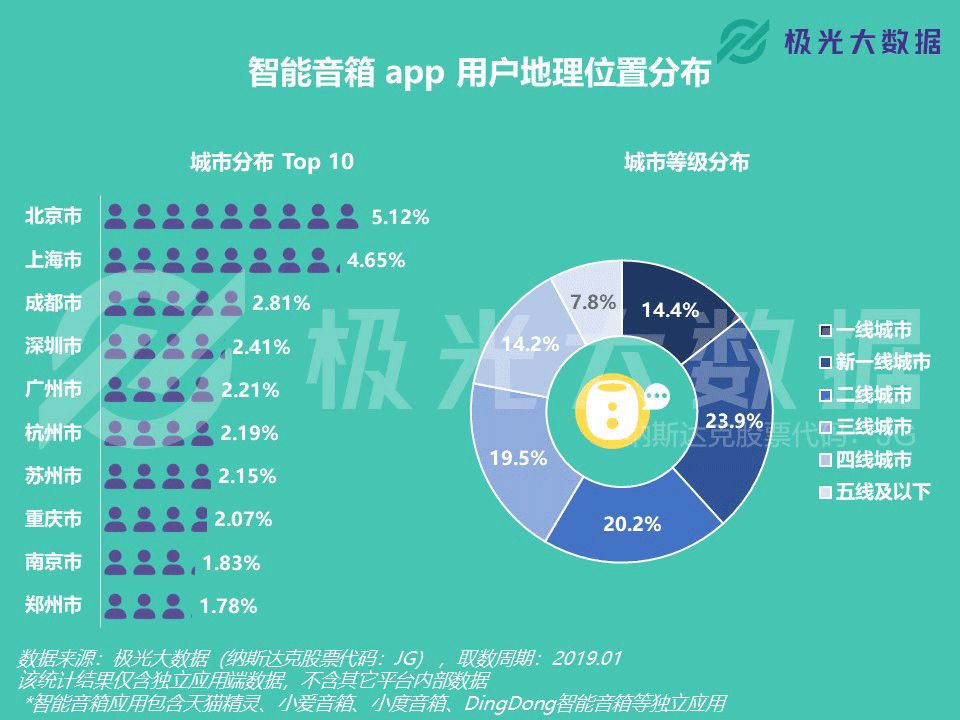 极光大数据:智能音箱app行业渗透率2.15% 极光大数据(Aurora Mobile, Nadaq: JG)从行业市场渗透率、用户规模、用户安装数量、用户画像以及应用偏好度等维度对智能音箱app行业发起了市场洞察分析。随着阿里巴巴、百度、腾讯、京东、科大讯飞等公司纷纷推出智能音箱产品,智能音箱也被广泛视为智能家居赛道的重要一环。结合极光大数据的统计结果,我们可以看看智能音箱app行业的发展情况和受众画像。 行业用户规模2,370万,用户人均安装1.03款 极光大数据的统计结果显示,智能音箱app的行业渗透率和用户规模在过去一年的上升趋势非常显著。在18年1月,智能音箱app行业用户规模为257万。截至19年1月,该行业用户规模上升至2,370万,较18年同期上升超过8倍。与此同时,智能音箱app的行业渗透率为2.15%,仍具备广阔的市场空间。 截至19年1月,用户平均每人安装1.03款智能音箱app,且在过去一年智能音箱app的用户人均安装数量始终保持恒定。 更新至19年1月的用户安装数量分布结果显示,97.3%的用户仅在设备上安装1款智能音箱app。安装数量为2款的用户占比为2.5%,只有0.2%的用户安装数量达到3款及以上。考虑到大部分智能音箱app均需搭配硬件使用,对于绝大部分用户而言,1款智能音箱产品似乎已经足以满足日常使用需求。 35岁及以下用户占比超8成,最多分布在北京、上海和成都 根据极光大数据的统计结果,智能音箱app中男性用户占比60.5%,女性用户占比39.5%。用户年龄分布结果显示,15.3%的智能音箱app用户年龄在25岁及以下,70.8%的用户年龄在26-35岁之间,36岁及以上用户占比13.9%。 截至19年1月,有14.4%的智能音箱app用户分布在一线城市,新一线和二线城市的用户占比分别为23.9%和20.2%。三线城市的用户占比为19.5%,也有22%的智能音箱app用户分布在四线及以下城市。 用户最偏好天猫精灵、小爱音箱和小度音箱,在线音箱偏好虾米和网易云 截至19年1月,用户偏好度最高的智能音箱app是天猫精灵、小爱音箱和小度音箱,随后是DingDong智能音箱、小度在家和出门问问。此外,小雅AI音箱、斐讯AI、腾讯听听和小Biu音箱也跻身用户偏好度Top 10行列。 在在线音乐app当中,智能音箱app用户最偏好虾米音乐、网易云音乐以及QQ音乐。在移动电台app当中,智能音箱app用户最偏好喜马拉雅、蜻蜓FM和荔枝。而在有声阅读app中,目标用户群体最偏好得到、樊登读书和懒人听书。 在电子书app中,智能音箱app用户最偏好多看阅读、微信读书以及Kindle阅读。在教育学习行业,智能音箱app用户人群最偏好微软翻译、有道翻译官和凯叔讲故事。而在智能音箱以外的智能AI应用中,目标用户最偏好智能识物、阿里智能和智慧星。 更多阅读:eMarketer:2019年中国最受关注的五大趋势Omdia:2020年全球智能音箱市场出货量达1.54亿 同比增长58%RUNTO:2022年中国六大客厅智能设备线上总销量3815万台Hub:2023年美国联网家庭报告Strategy Analytics:2022年Q1全球智能音箱和智能屏总出货量3530万台 同比下降5%Ofcom:研究发现智能音箱能帮助独自生活的人减少孤独感NPR:2020年智能音频报告comScore:2019-2021年谷歌智能音箱用户数量增长234%eMarketer:预计2020年近70%的美国智能音箱用户使用的是EchoComScore:智能音箱使用高峰是上午8点到中午Strategy Analytics:2019年Q4全球智能音箱销量达到1.469亿eMarketer:2020年美国智能音箱用户将达到8310万人Edison:2019年冬季智能音频报告Strategy Analytics:2020年全球智能音箱出货量达1.51亿 50%都在使用联发科的应用处理器PulseLabs:COVID-19期间语音助手用户行为调查报告