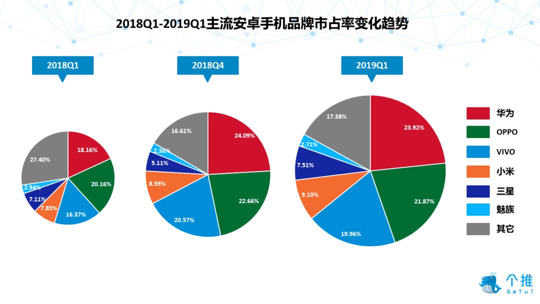 个推大数据(股票代码:300766)推出《2019年Q1国内安卓智能手机报告》,从市场概况、用户换机行为、用户画像等角度对六大主流安卓手机品牌进行洞察。